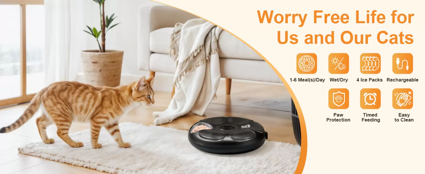 Comedero de 6 platos para comida humeda y seca. Incluye packs de hielo para mantener la frescura 24 horas, bateria recargable de 45 dias y diseño de seguridad para patas.