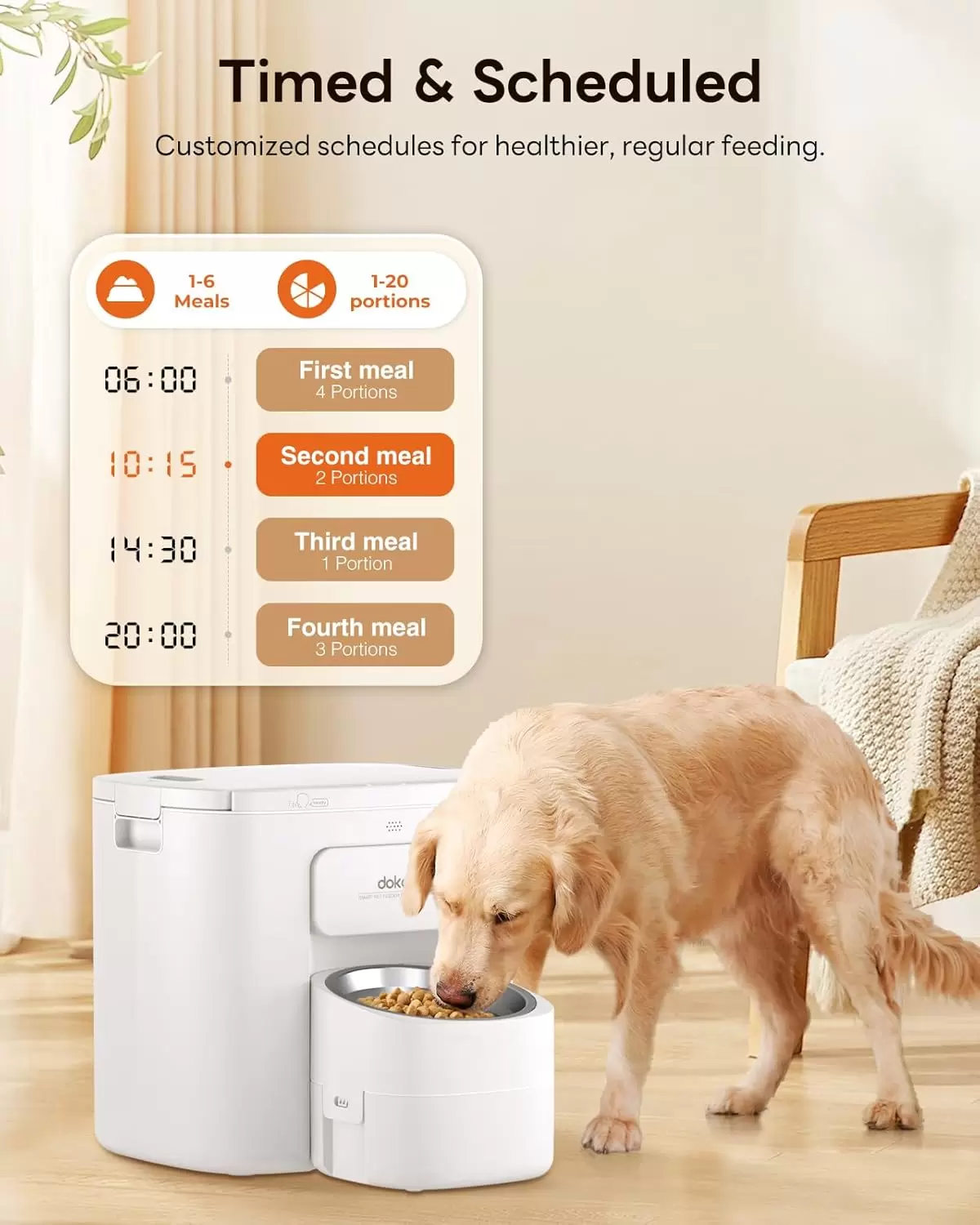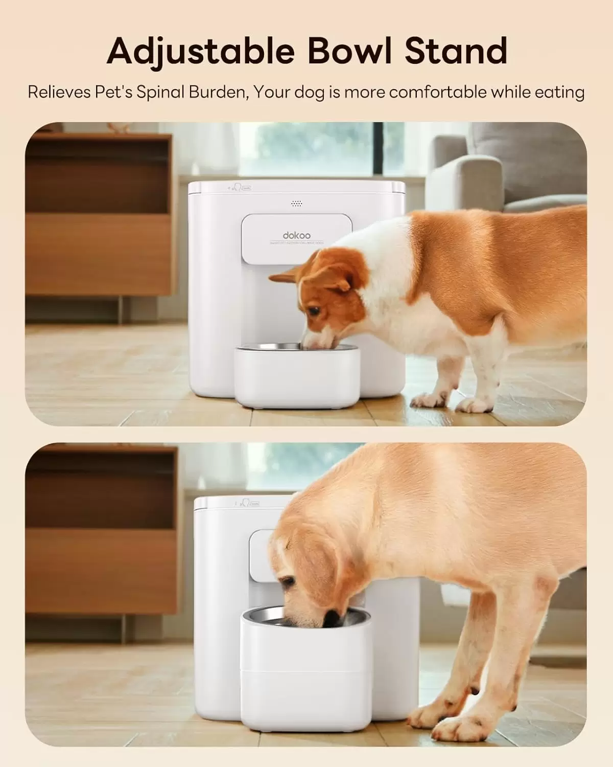 Comedero de 7 kg con sellado al vacio para mantener la frescura. Incluye soporte ajustable para cuidar la columna de perros grandes y programacion manual sencilla sin necesidad de internet.