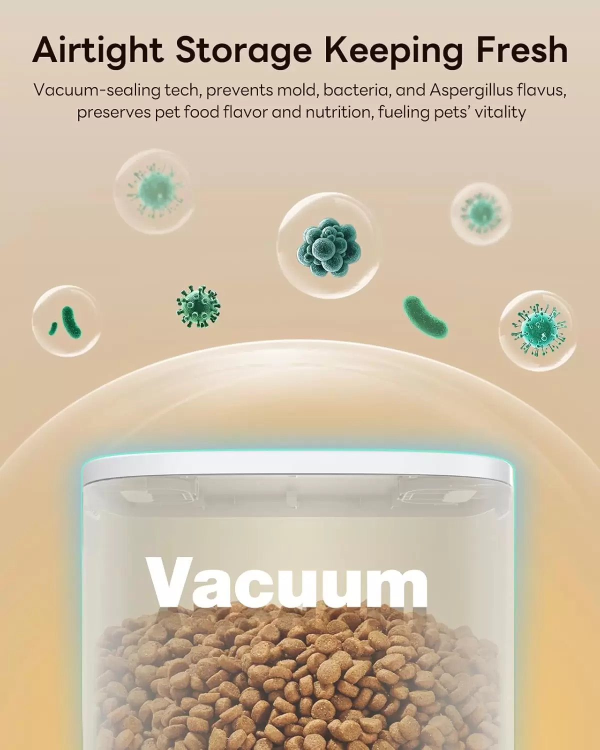 Tecnología de sellado al vacío para máxima frescura Este comedero automático cuenta con un sistema exclusivo de sellado al vacío que elimina el aire y el oxígeno del depósito. Esto evita que la comida se oxide o se ponga rancia, manteniendo cada croqueta tan crujiente y nutritiva como el primer día. Es ideal para asegurar que su mascota siempre tenga un alimento saludable y con buen sabor.