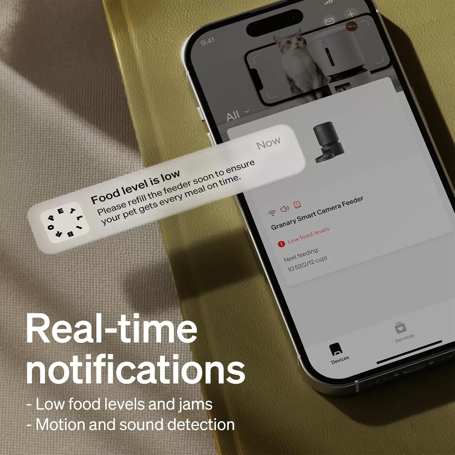 Control inteligente por App y conexión estable Programe fácilmente hasta 10 comidas al día con porciones ajustables desde su smartphone. Gracias a su compatibilidad con redes WiFi de 2.4 y 5 GHz, el dispositivo asegura una conexión estable y sin interrupciones. La aplicación también envía alertas instantáneas si el nivel de comida es bajo o si ocurre cualquier inconveniente con la entrega del alimento.
