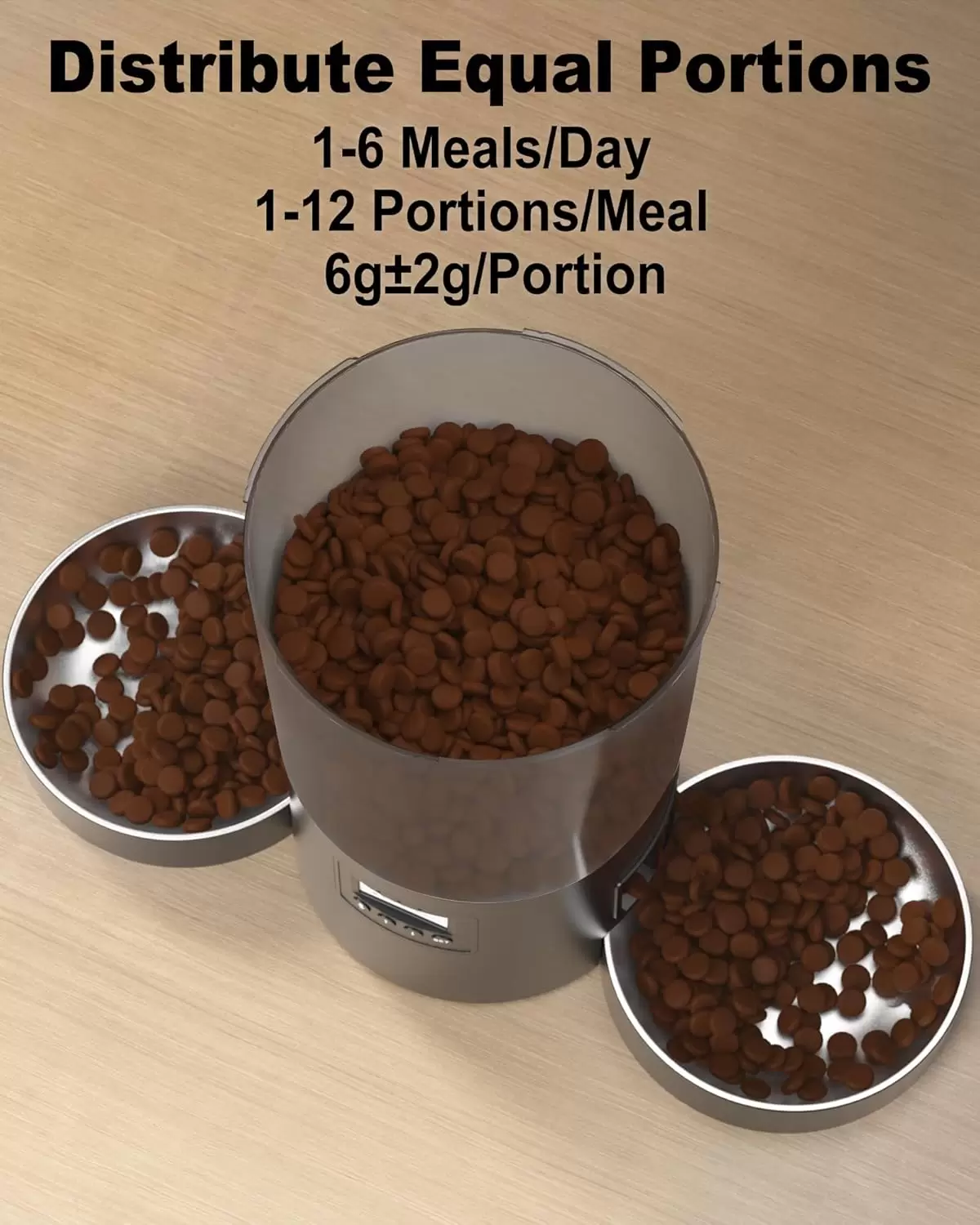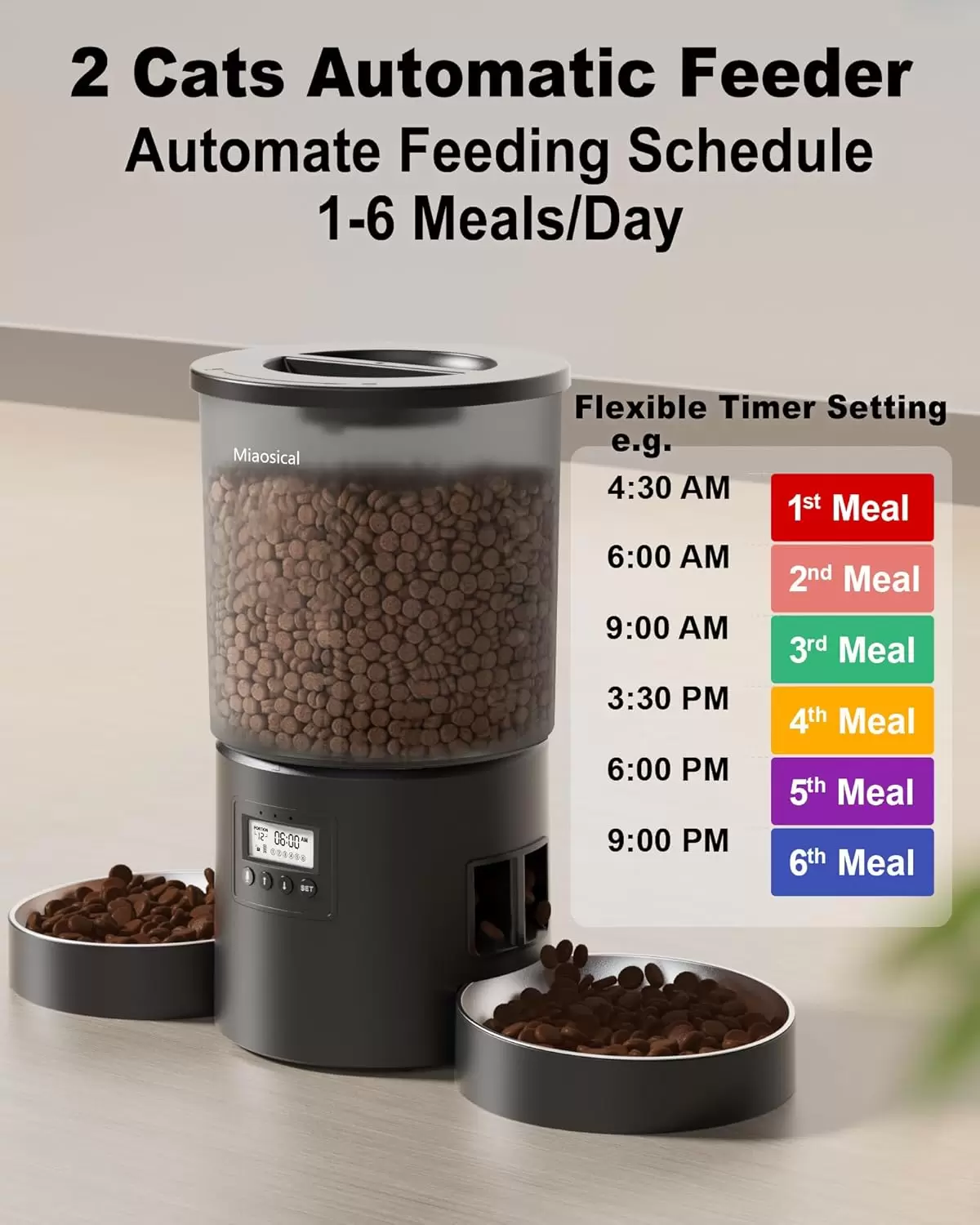 Comedero doble de 1.9 kg para dos gatos. Programable hasta 6 comidas, incluye grabacion de voz, platos lavables y sistema antiatascos. La mejor solucion para alimentar a dos mascotas simultaneamente.