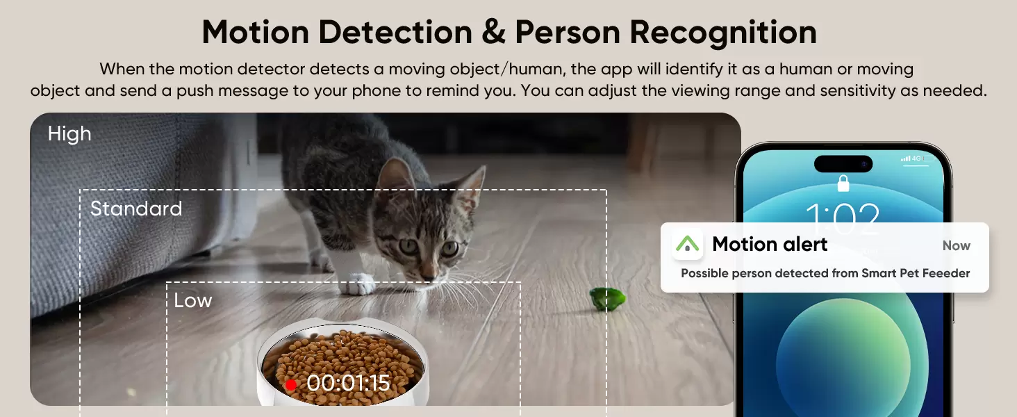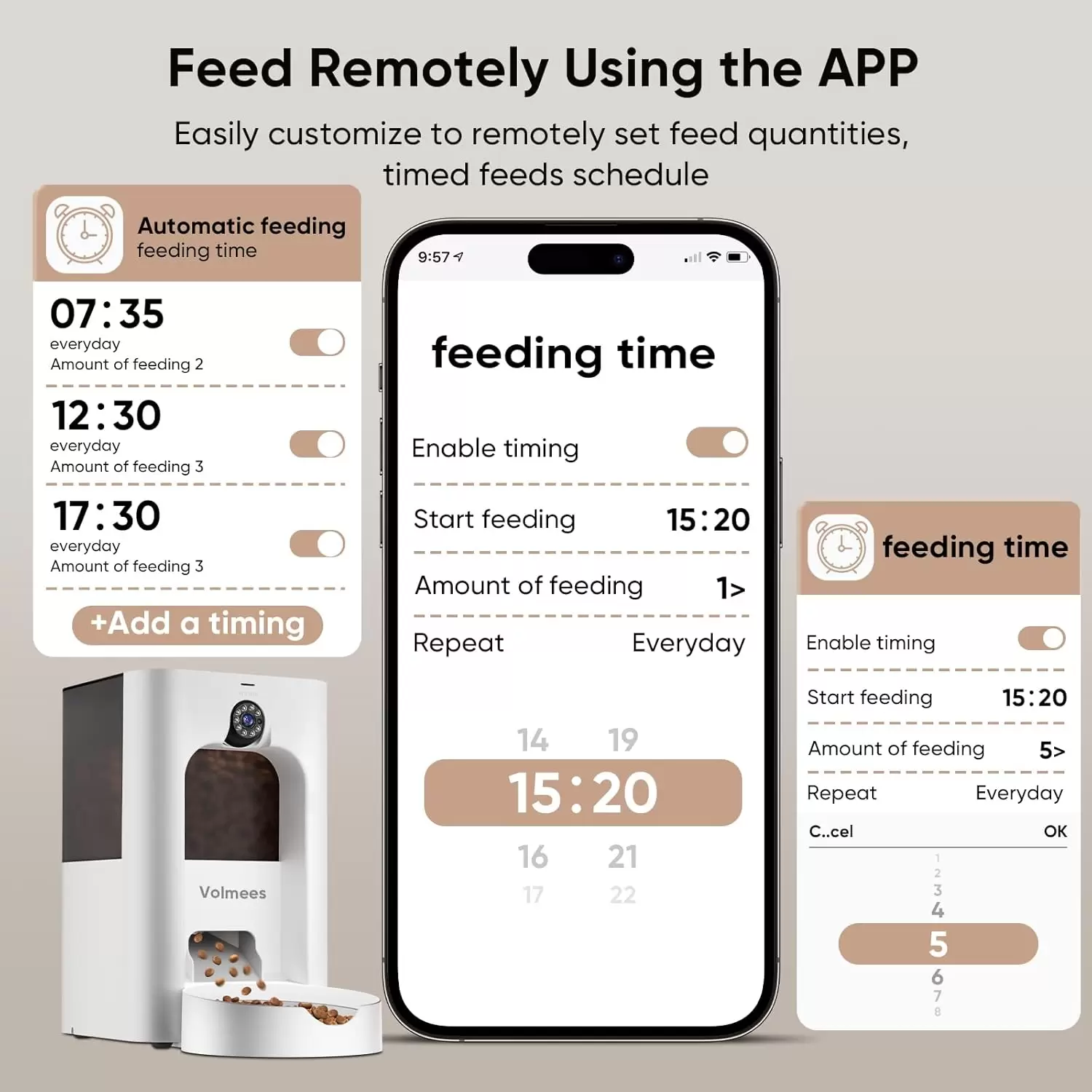 ALIMENTACIÓN AUTOMÁTICA TEMPORADA: Puede configurar el horario de alimentación a través de la aplicación, el alimentador automático para gatos seguirá el horario establecido y dispensará automáticamente los alimentos a intervalos regulares todos los días. Asegúrese de que su mascota esté comida regular y saludable con un alimentador automático de alimentos para gatos. Elija entre 00:00-23:59 minutos y 1-10 opciones de servicio para crear una dieta personalizada para su mascota. Cuando viajas, puedes realizar un seguimiento de los alimentos dispensados y el estado alimentario de tu mascota en tiempo real dentro de la aplicación.