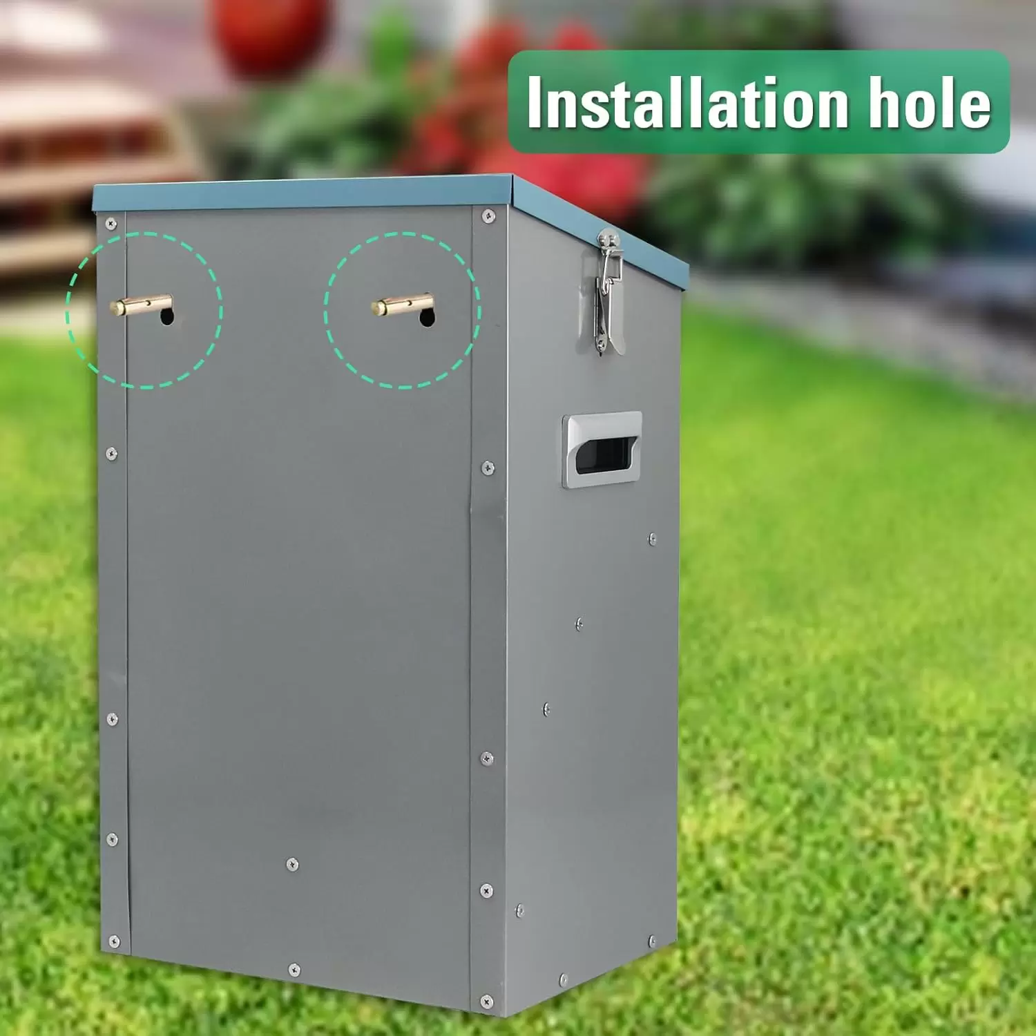 El comedero para perros con asas en ambos lados para mover cómodamente el comedero. La parte superior está equipada con un cierre de bloqueo, que es más seguro y no será abierto por el perro accidentalmente. La tapa alargada tiene función de protección contra la lluvia, bloqueando eficazmente que la lluvia entre en el comedero y moje la comida, y la apertura del panel superior es lo suficientemente grande como para añadir alimentos fácilmente.