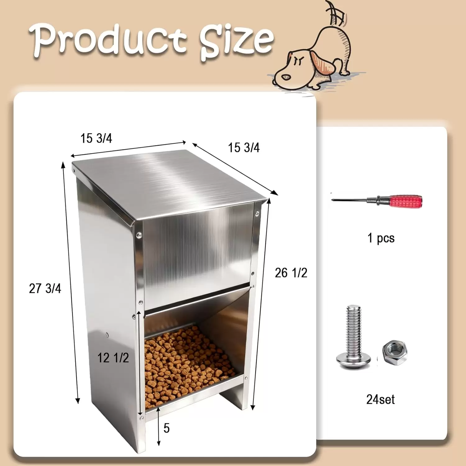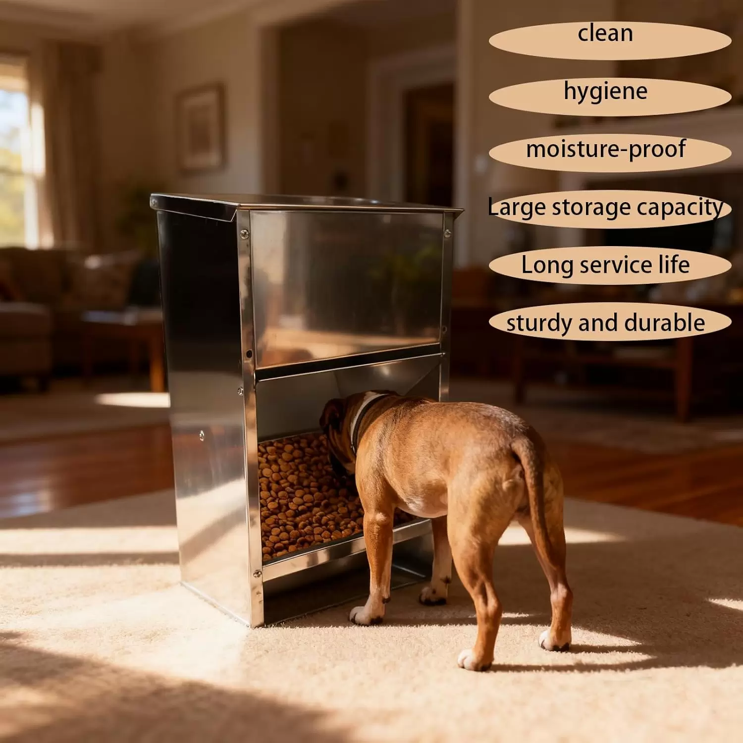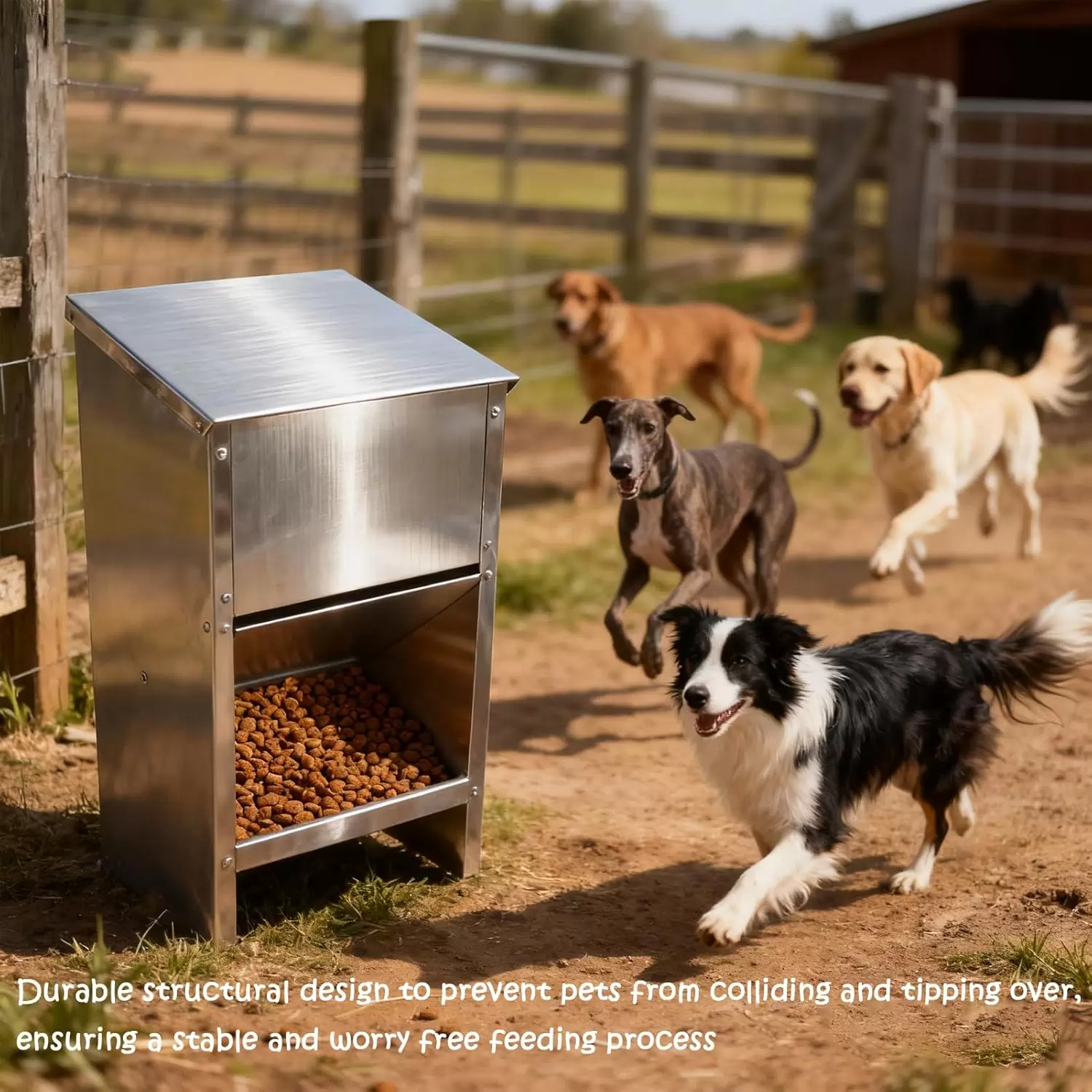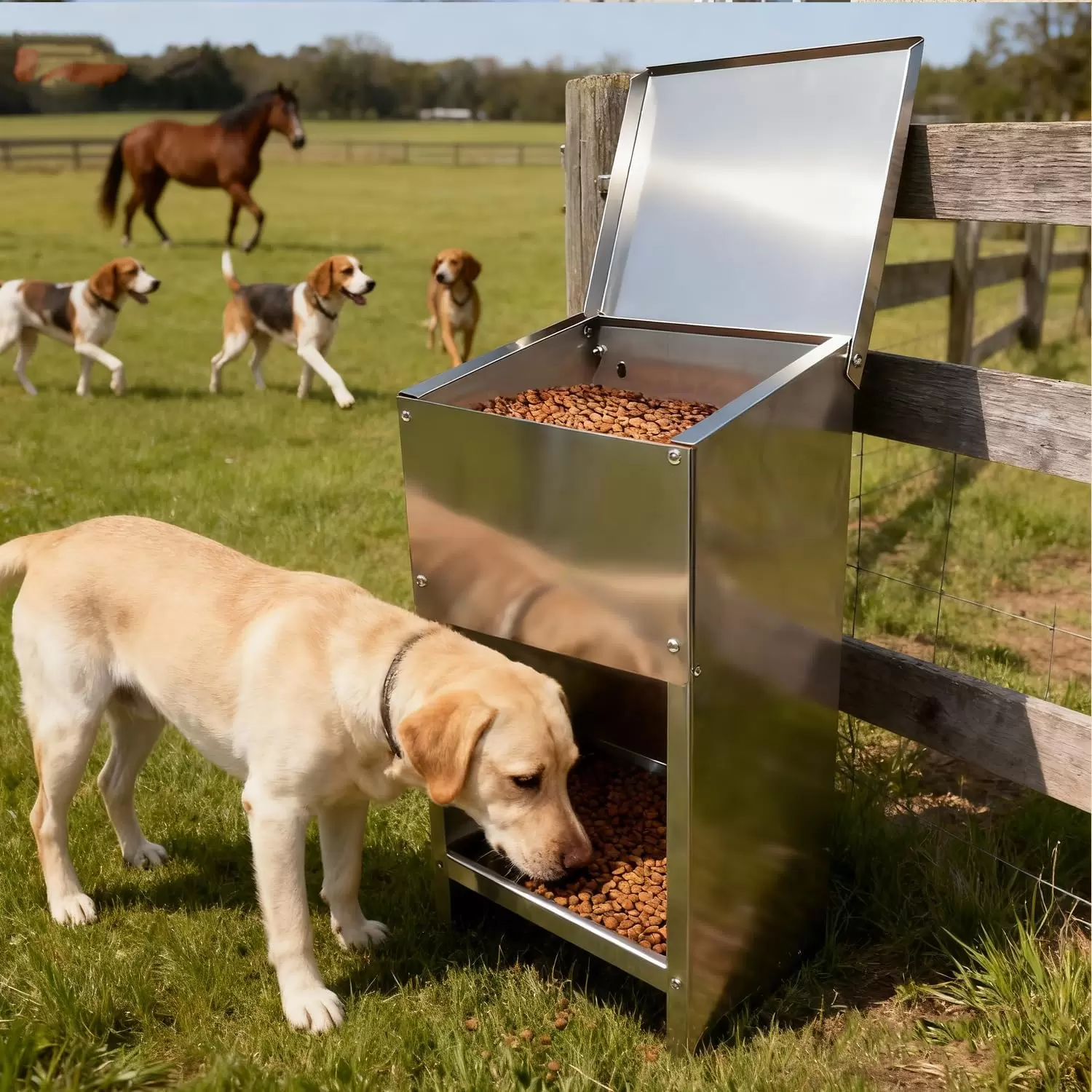 Comedero de 11 kg o 23 kg en acero inoxidable premium. Diseñado para perros grandes y multiples mascotas, ofrece alimentacion autonoma, segura y protegida contra plagas en patios y parcelas.