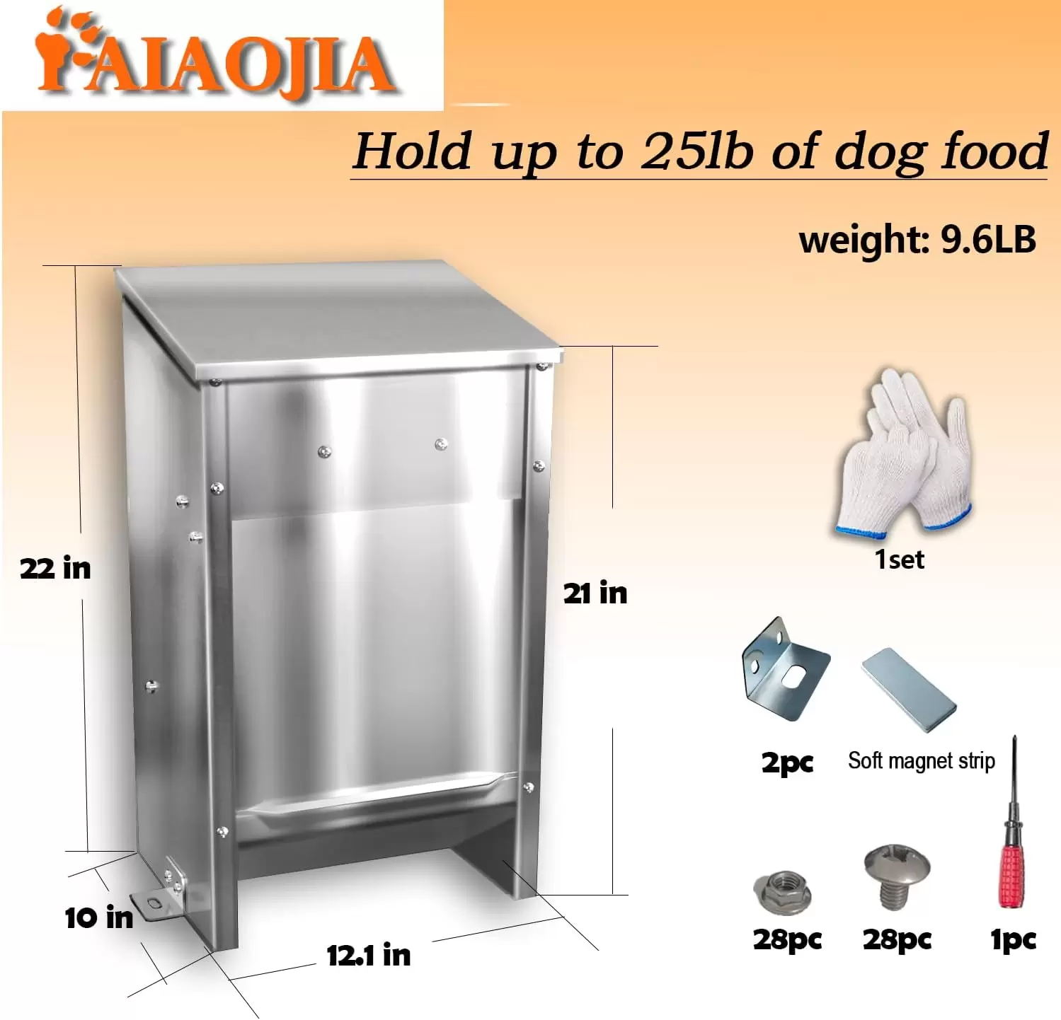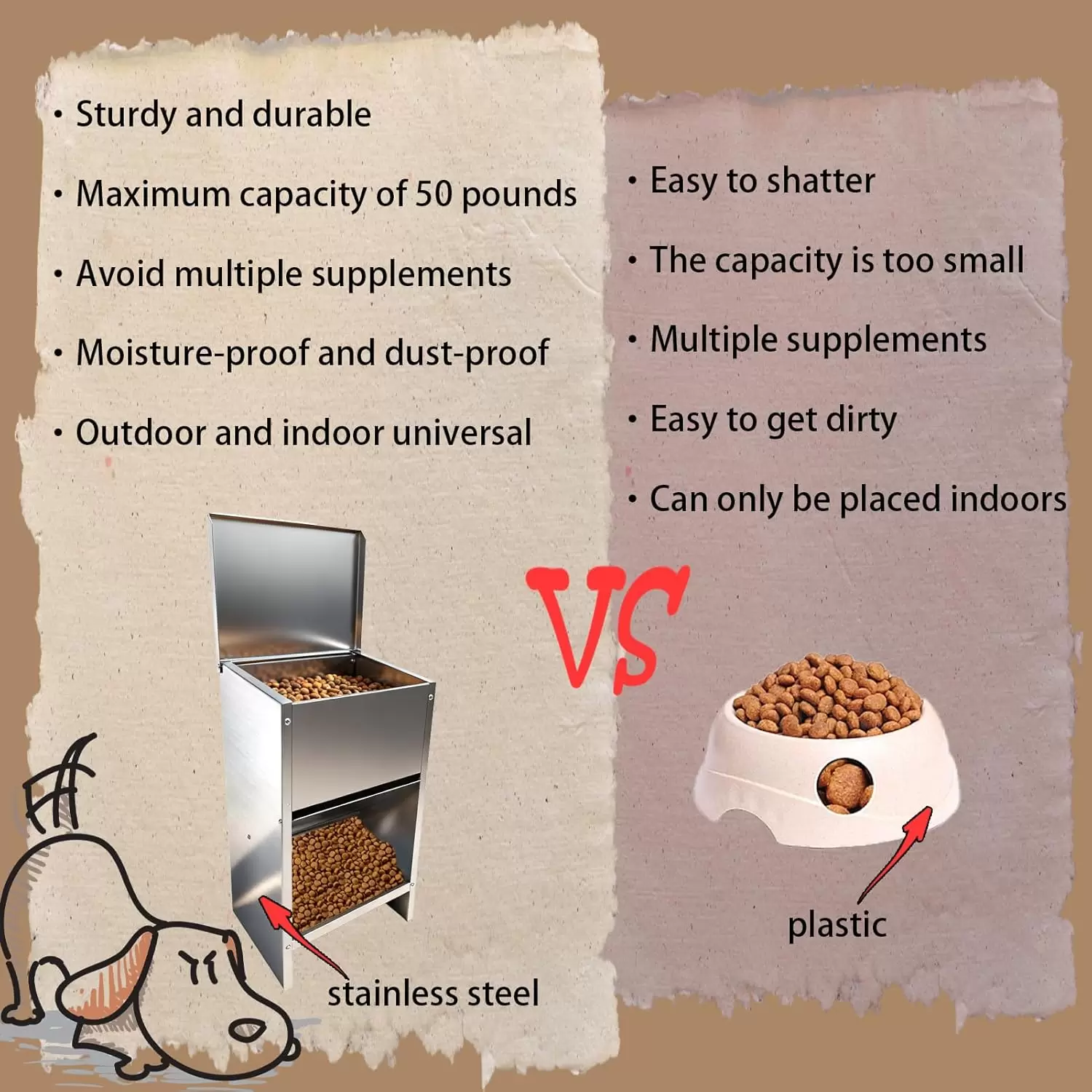 Puerta magnética inteligente contra plagas Este modelo incluye una puerta con cierre magnético suave que se abre solo cuando el perro la empuja para comer. Esto evita que moscas, ratones o aves entren al depósito, manteniendo el alimento limpio, seco y libre de contaminantes externos, algo vital para la salud de sus animales en exteriores.