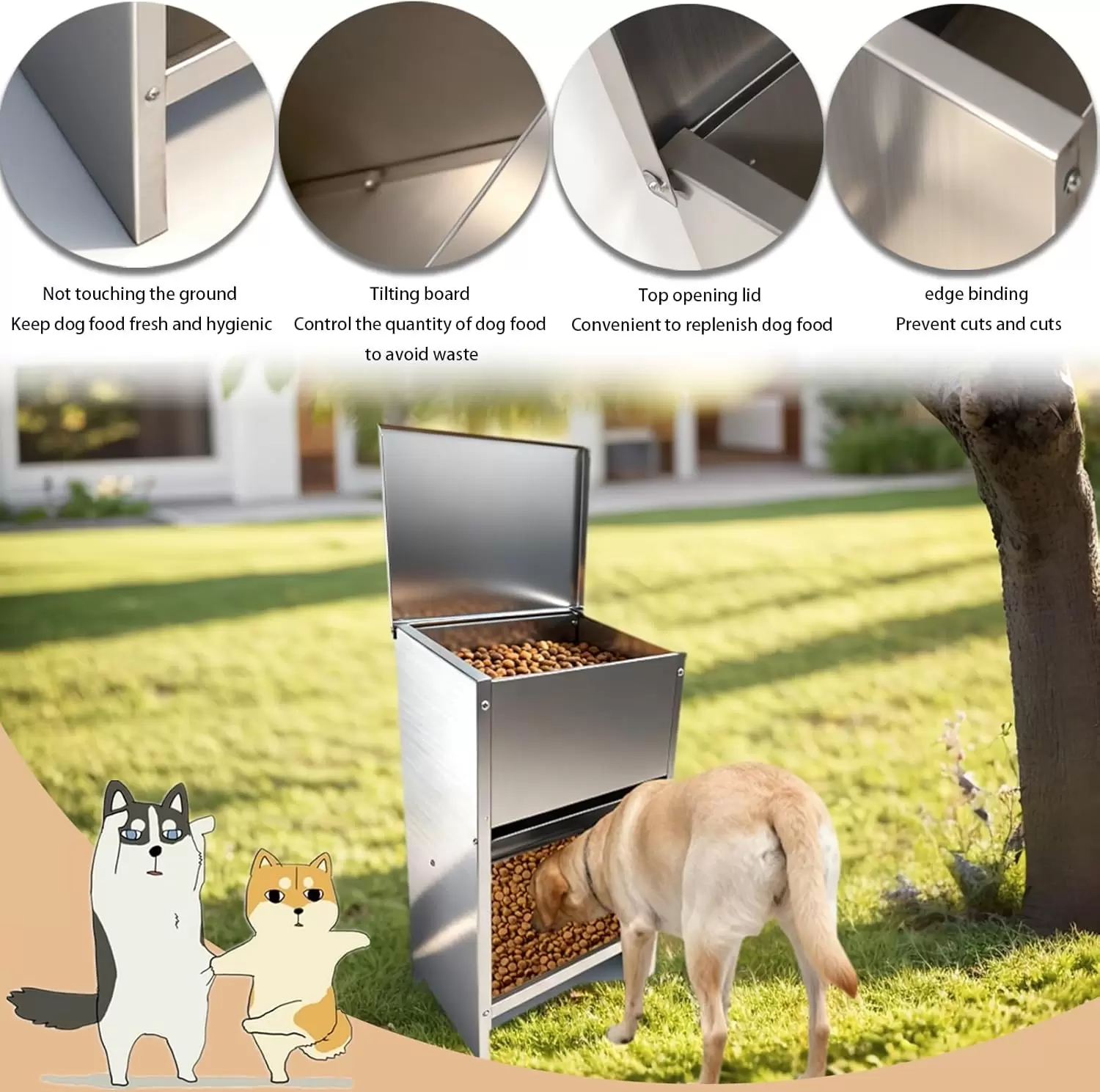 Acero inoxidable premium: La mejor inversión para su mascota A diferencia de los comederos de plástico o hierro que se oxidan, este dispensador está fabricado íntegramente en acero inoxidable de alta calidad. Es un material higiénico, libre de pinturas industriales y extremadamente resistente a los arañazos y mordidas. Su diseño con bordes redondeados garantiza que su perro coma de forma segura y sin riesgos de cortes.