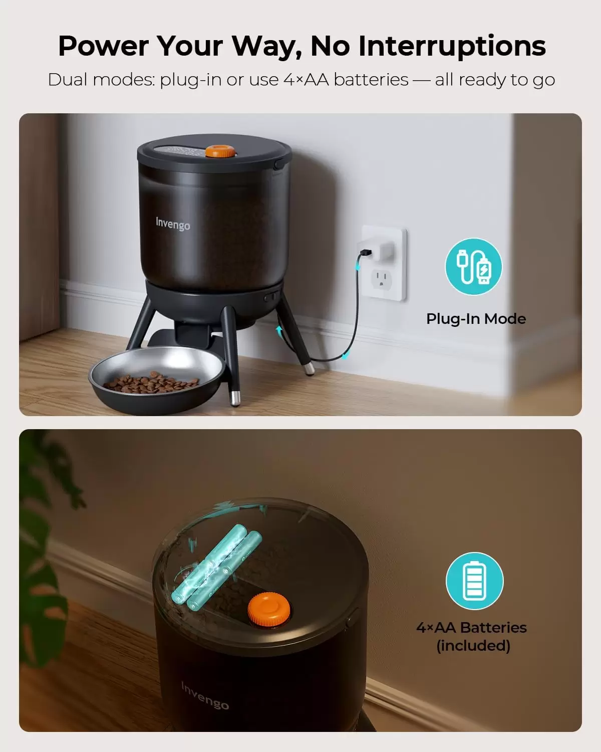Fuente de alimentación dual: funciona con batería y USB: disfruta de la tranquilidad con este alimentador automático para gatos alimentado por USB y 4 pilas AA (incluidas). Mantiene la alimentación incluso durante cortes de energía.