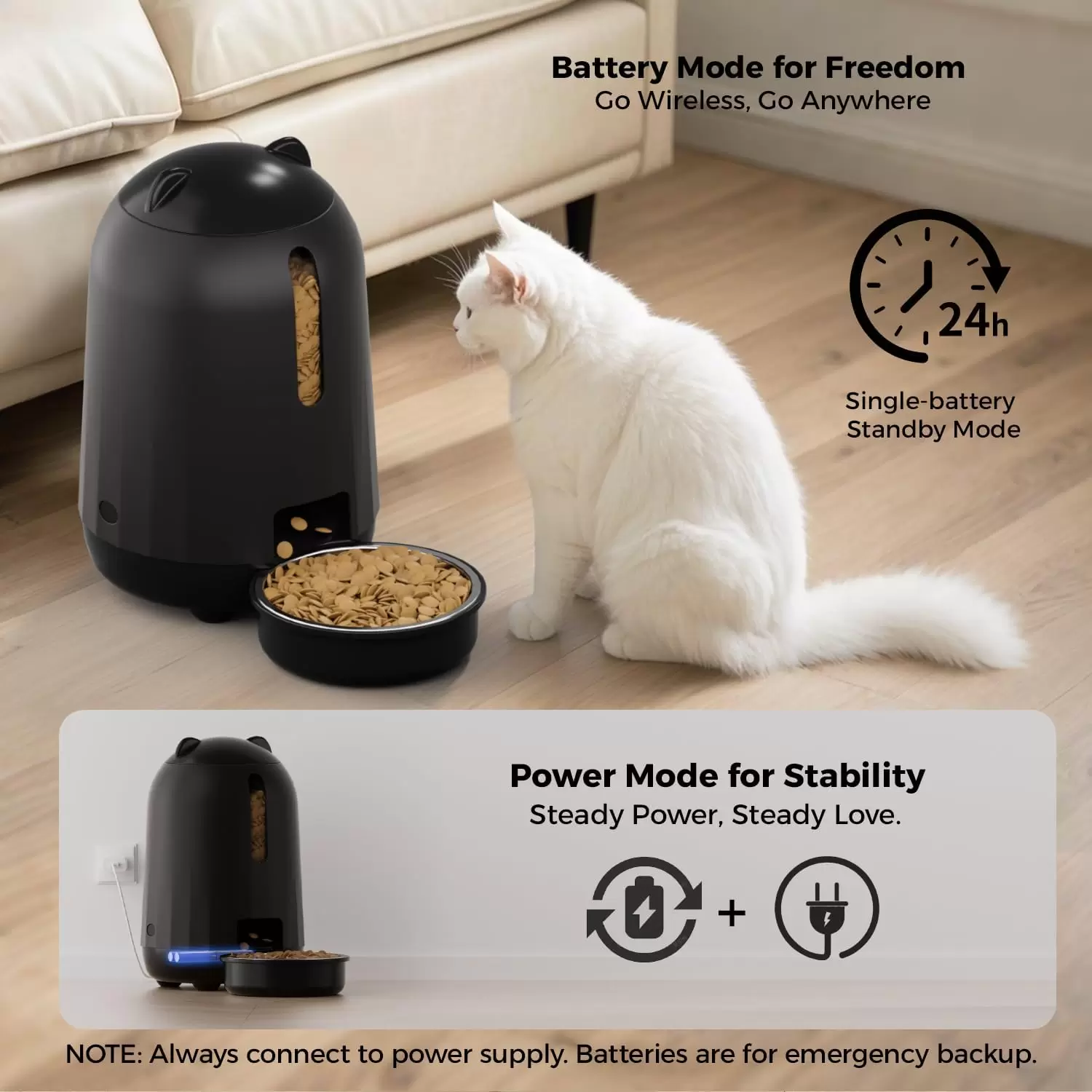 【Fuente de alimentación dual, no te preocupes por cortes de energía】Los comederos automáticos PAPIFEED para gatos admiten una fuente de alimentación de modo dual: enchufe + batería de respaldo (4 pilas AA, no incluidas). Cambia automáticamente a energía de respaldo cuando se producen cortes de energía, asegurando que los gatos coman a tiempo y los propietarios puedan salir con más tranquilidad. Consejos: Se recomienda mantener el modo de fuente de alimentación dual para el uso diario para garantizar que la batería de respaldo esté siempre cargada para hacer frente a cortes de energía repentinos.