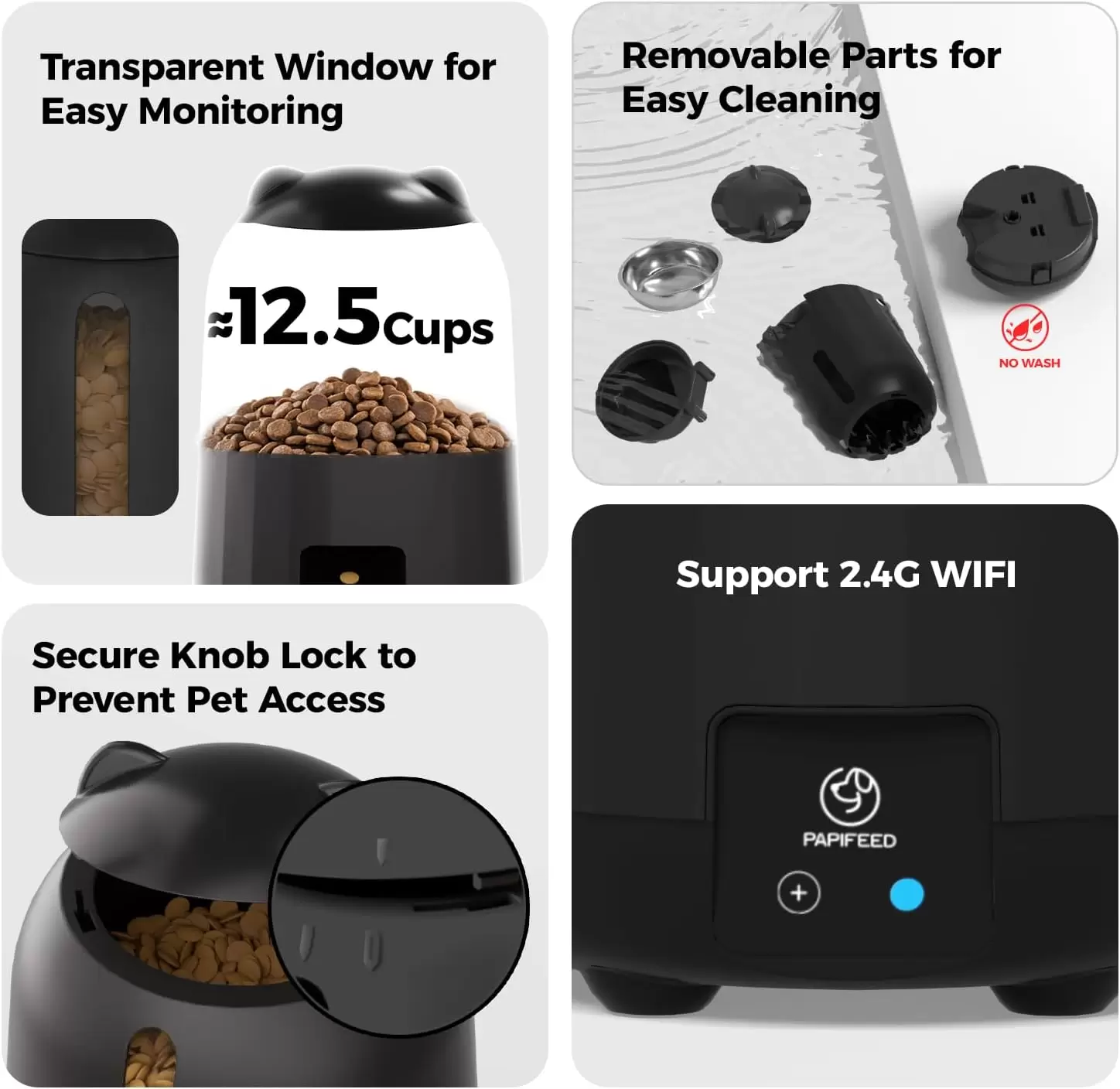 Diseño sellado a prueba de humedad para mantener fresca la comida de gato: el comedero automático para gatos PAPIFEED no solo tiene una caja desecante integrada + un contenedor de grano sellado, que aísla eficazmente la humedad y evita que la comida para gatos se humedezca y se eche a perder. También utiliza un diseño de cubierta de cubo tipo perilla que debe girarse manualmente para abrirse para evitar que las mascotas arañen y roben alimentos, protegiendo así la seguridad alimentaria. Desde la primera alimentación hasta la última comida, asegura que cada grano de comida que consume tu mascota permanezca crujiente.