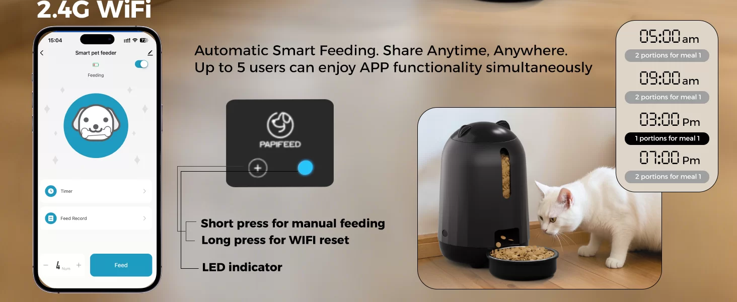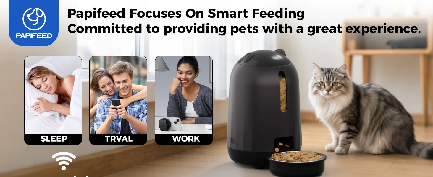 Control inteligente de aplicación para una alimentación sin complicaciones: el comedero automático PAPIFEED para gatos (compatible con WiFi de 2.4 G) puede dispensar alimentos manualmente en cualquier momento y en cualquier lugar a través de la aplicación, y comprobar el registro de alimentación en tiempo real. También puede personalizar un horario de alimentación de acuerdo con las necesidades de su mascota, controlar con precisión la cantidad de cada comida y administrar científicamente la salud dietética. Consejo: Cuando se alimenta con una batería de respaldo, el alimentador permanecerá fuera de línea (no se puede conectar a la APP), pero aún implementará estrictamente el plan de alimentación preestablecido para garantizar que su mascota coma a tiempo.