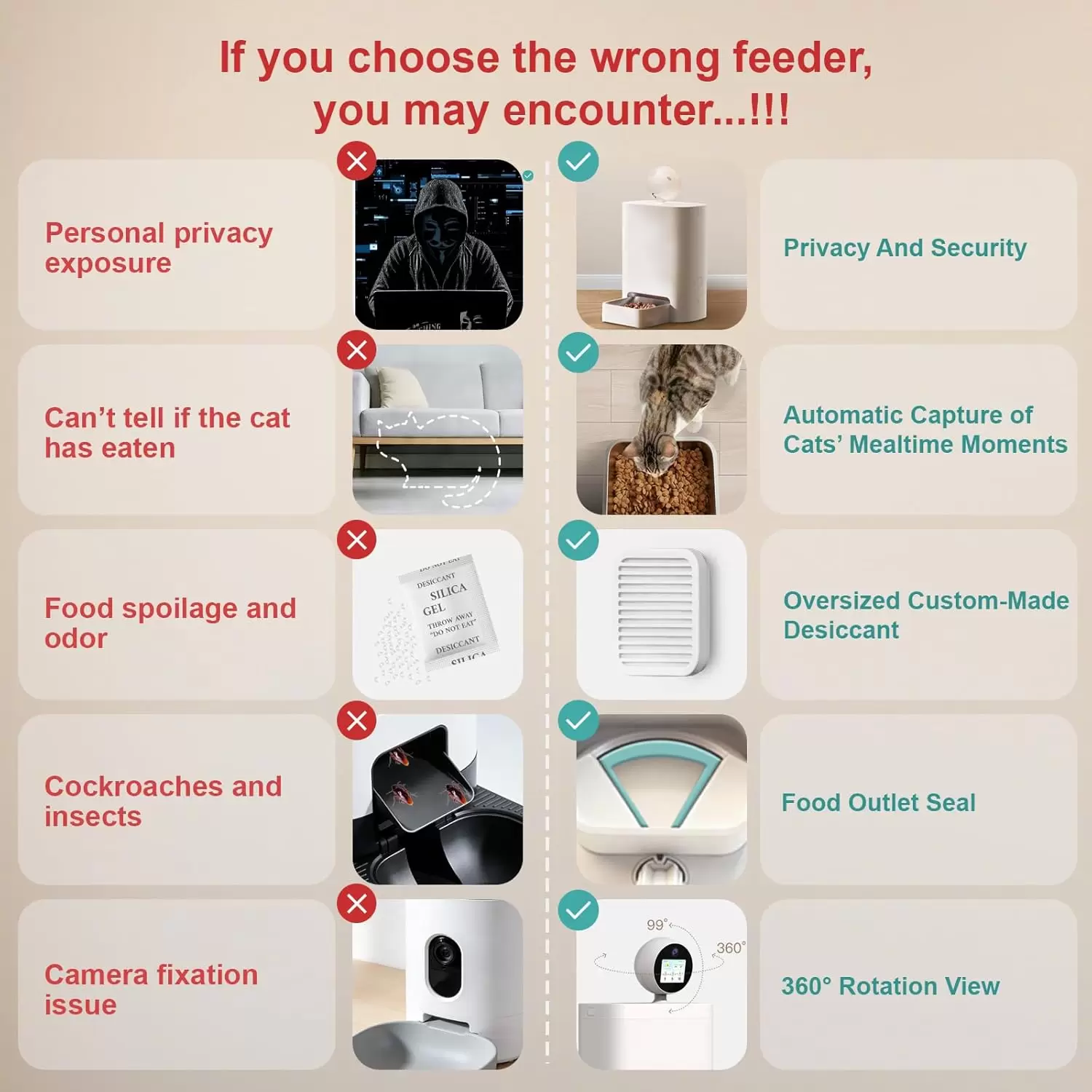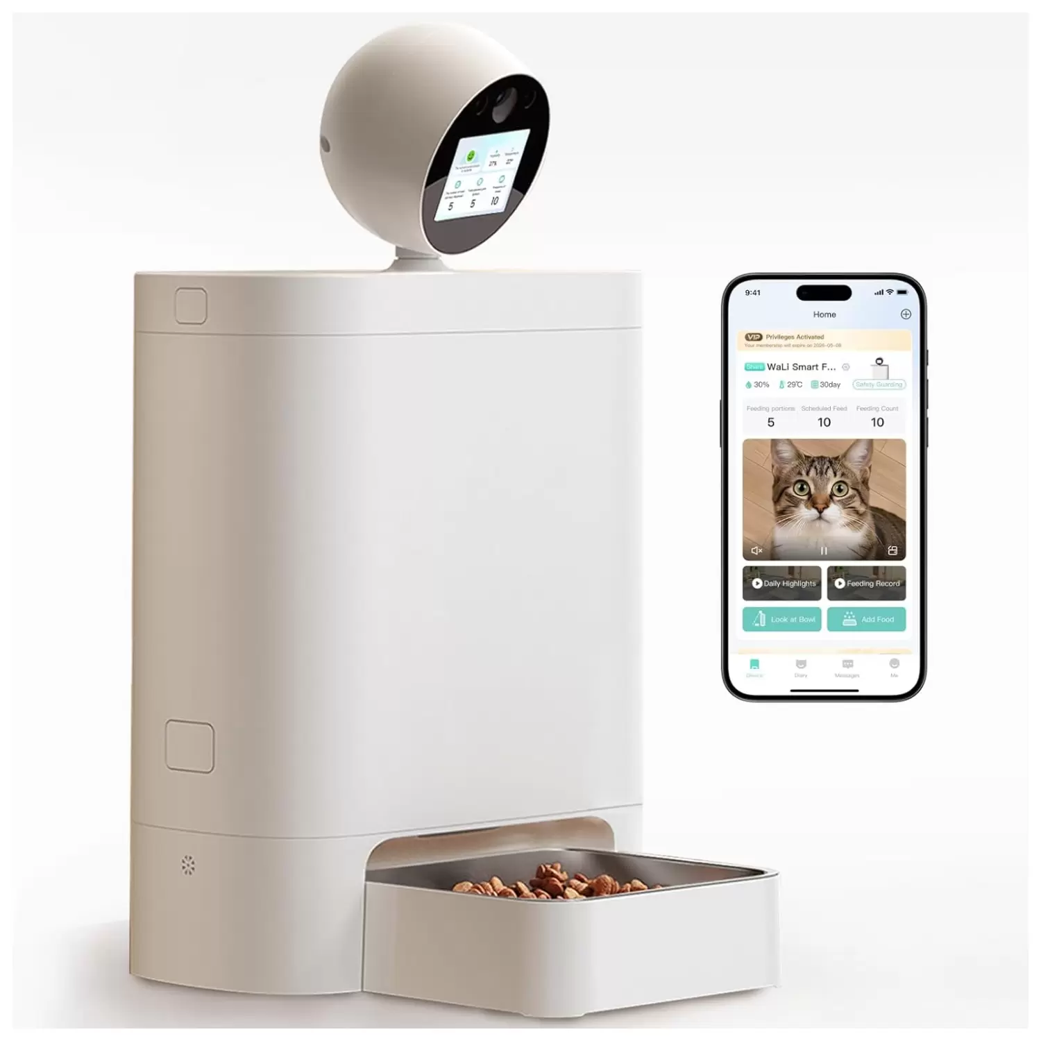 Comedero de 2.5 kg con camara 2K giratoria y WiFi 5G. Incluye pantalla IPS, audio bidireccional, sistema anti atascos y programacion de 16 comidas diarias para una nutricion perfecta y segura.