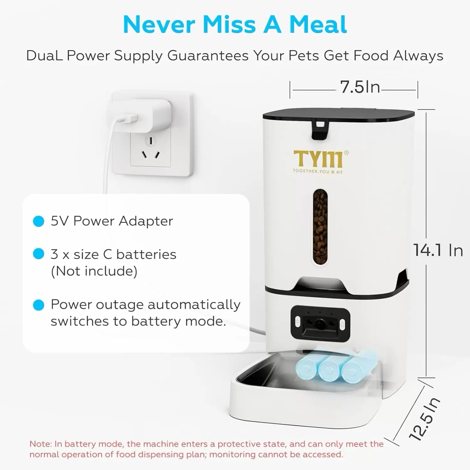 Seguridad extrema contra imprevistos Diseñado para resistir cortes de luz o travesuras, este equipo cuenta con un sistema de respaldo por baterias que mantiene el horario de comida intacto aunque falle la energia. El cable reforzado anti mordidas y la tapa con cierre de seguridad garantizan que el alimento se mantenga fresco y fuera del alcance de las mascotas antes de tiempo. Es el aliado tecnologico mas robusto y confiable para su hogar.