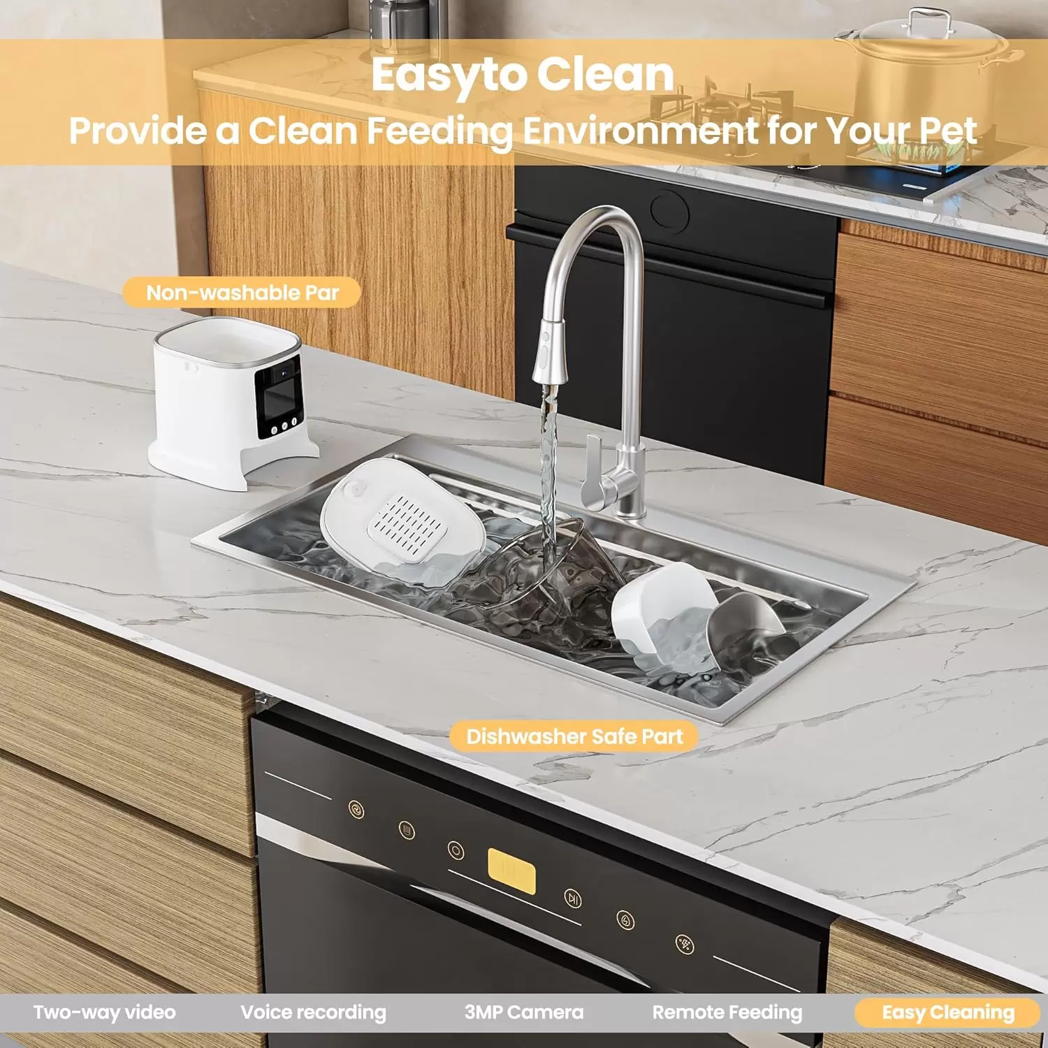 Capacidad de 3 kg y frescura prolongada El depósito transparente de 7 litros permite almacenar hasta 3 kg de croquetas, manteniéndolas frescas y crujientes durante semanas gracias a su compartimento para desecante. Su diseño de 360 grados le permite revisar el nivel de comida de un vistazo. Para su comodidad, el tanque es totalmente desmontable y el plato de acero inoxidable es apto para lavavajillas, asegurando una higiene impecable en todo momento.