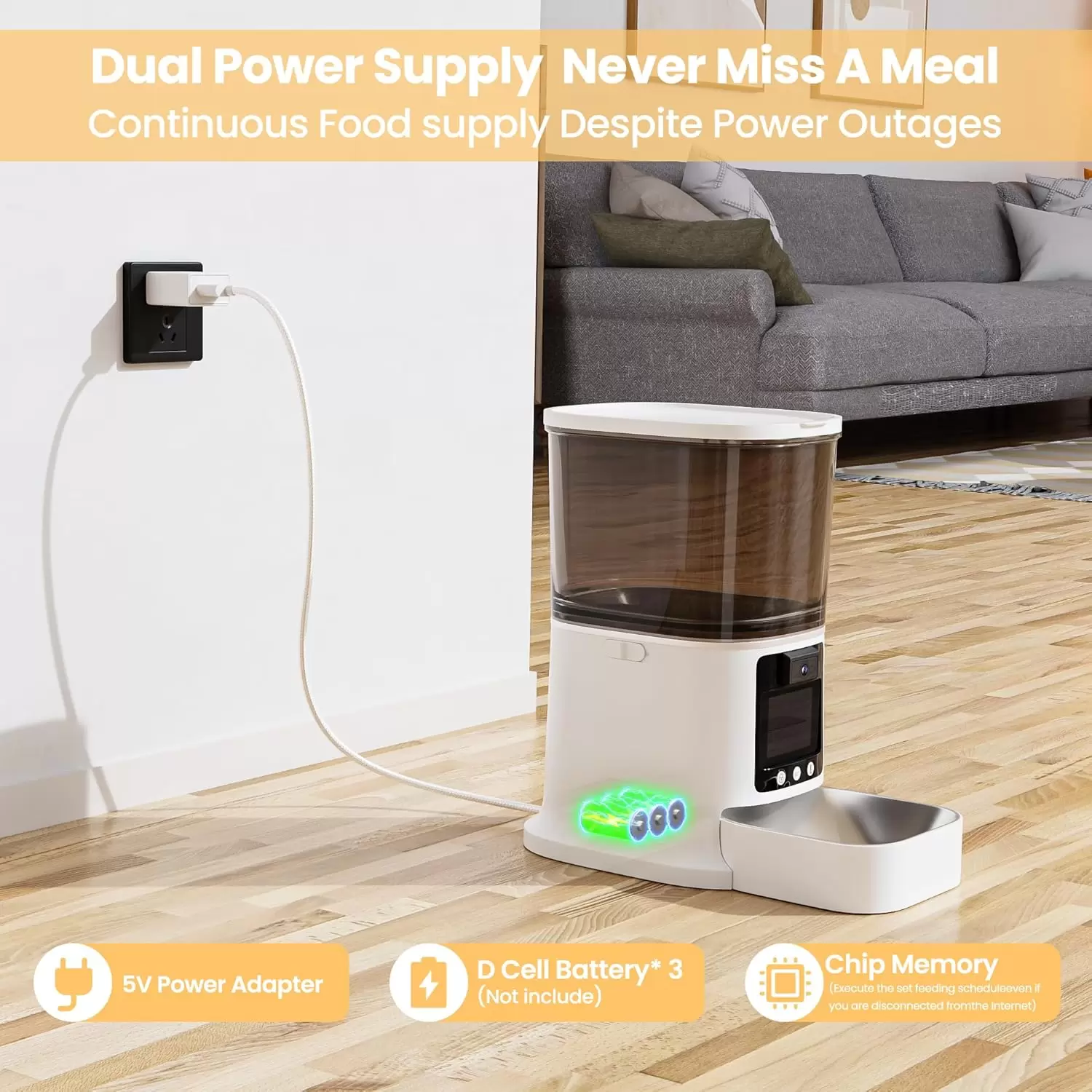 Diseño seguro a prueba de mordidas y cortes de luz Pensado para cachorros o mascotas curiosas, este modelo incorpora un cable reforzado de nailon que resiste tirones y mordidas. Para su tranquilidad durante las vacaciones, cuenta con un sistema de doble fuente de poder: funciona conectado a la corriente y permite instalar 3 pilas grandes de respaldo, asegurando que el plan de alimentación se cumpla aunque se corte la luz en su sector.