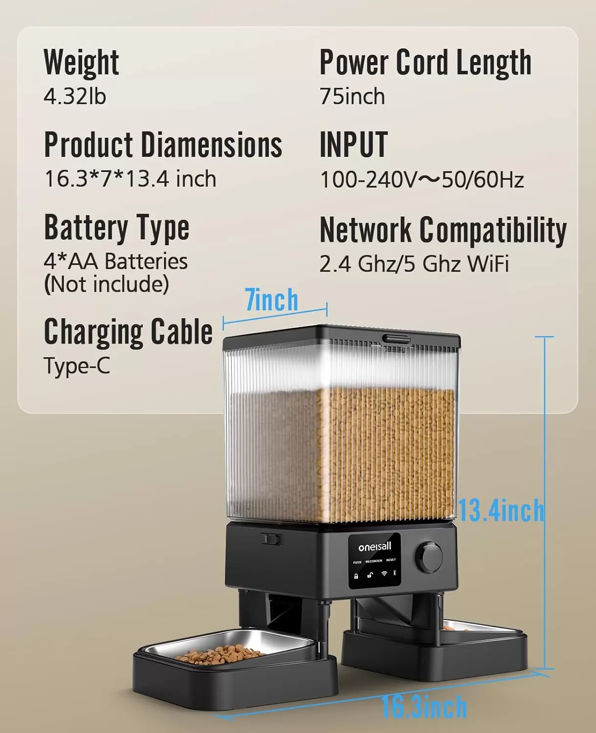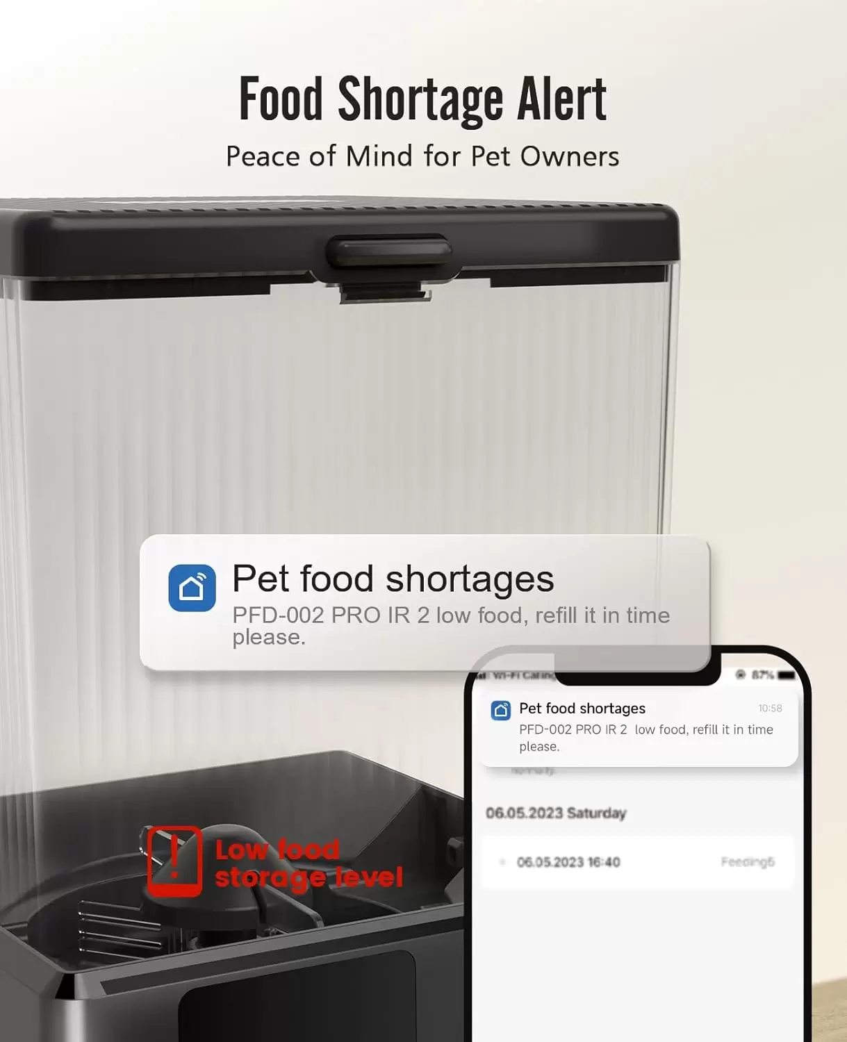 Conexión WiFi 5G estable y control remoto total A diferencia de los modelos básicos, este comedero se conecta a redes WiFi 5G y 2.4G, garantizando una señal mucho más estable y fluida. A través de la aplicación en su celular (iOS o Android), usted puede programar planes de alimentación o entregar raciones manuales desde cualquier lugar, manteniendo siempre un registro detallado del consumo de sus mascotas mientras está en el trabajo o de vacaciones.