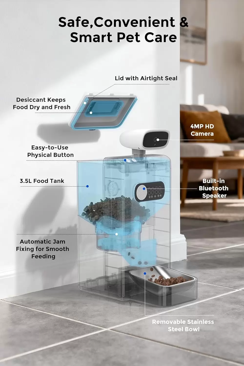Comedero de 1.6 kg con camara 4MP y laser. Ofrece juego remoto, audio en tiempo real, grabacion automatica de video y programacion por app para el cuidado total de tu mascota.