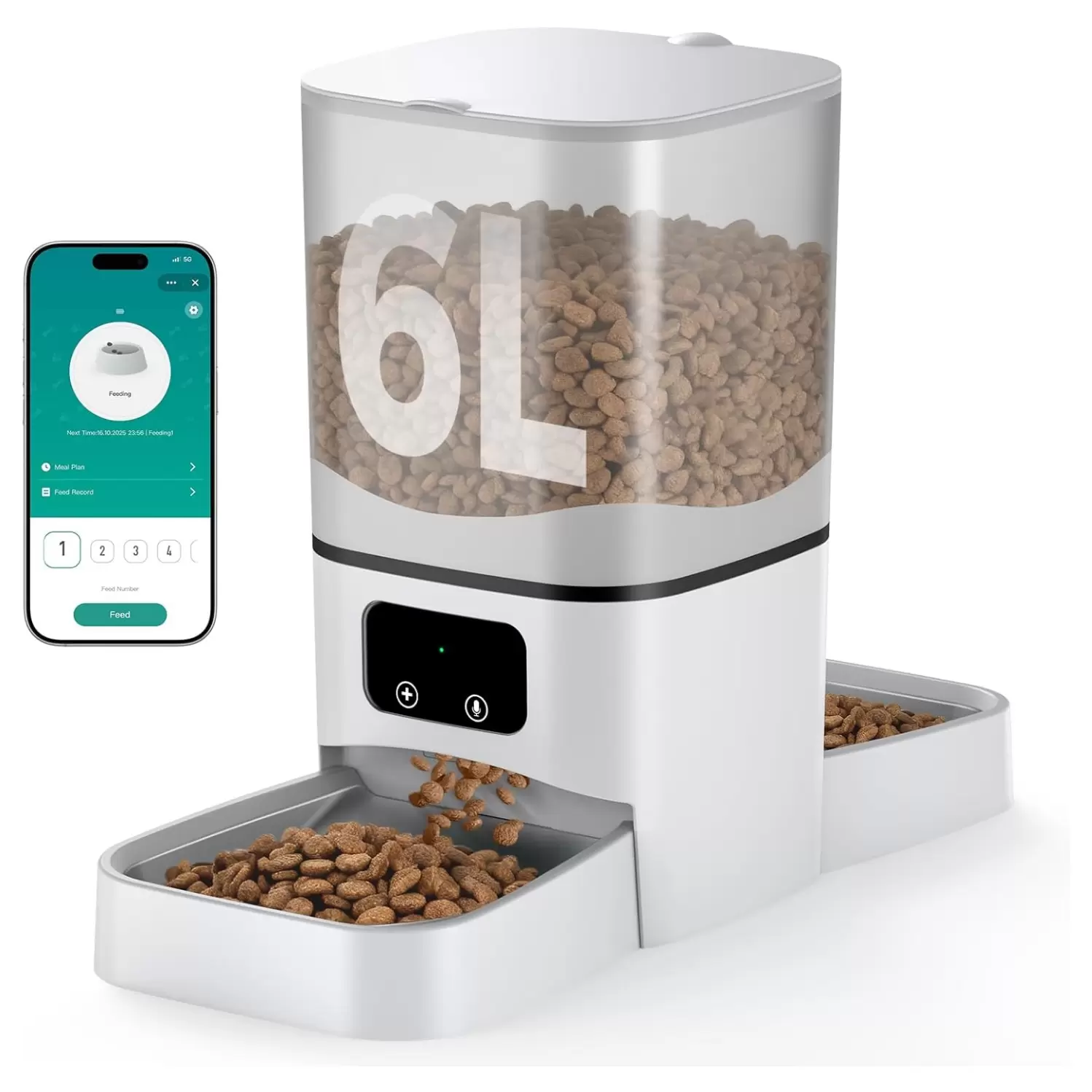 Comedero de 2.7 kg con doble plato y WiFi. Ideal para dos gatos, permite programar comidas desde el celular, incluye cable anti mordidas y grabacion de voz para un cuidado total.