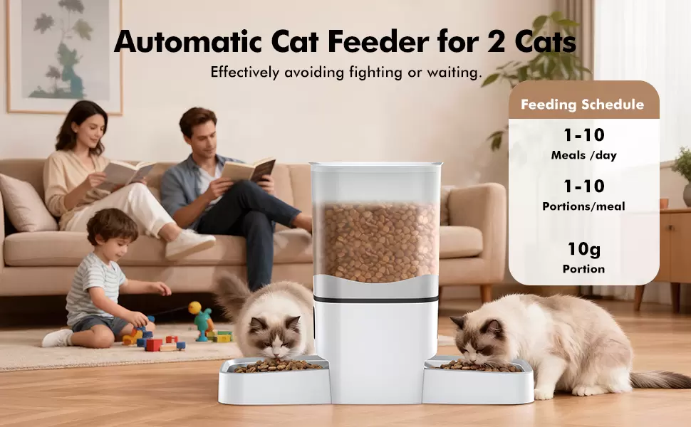 Alimentación simultánea y sin estrés para sus mascotas Este comedero automático ha sido diseñado específicamente para hogares con dos gatos o perros pequeños. Gracias a sus dos platos opuestos de acero inoxidable, permite que ambos coman al mismo tiempo en su propio espacio, eliminando la competencia por el alimento y asegurando un ambiente de paz en su hogar. Es la solución definitiva para dueños ocupados que buscan automatizar la rutina sin generar conflictos entre sus mascotas.