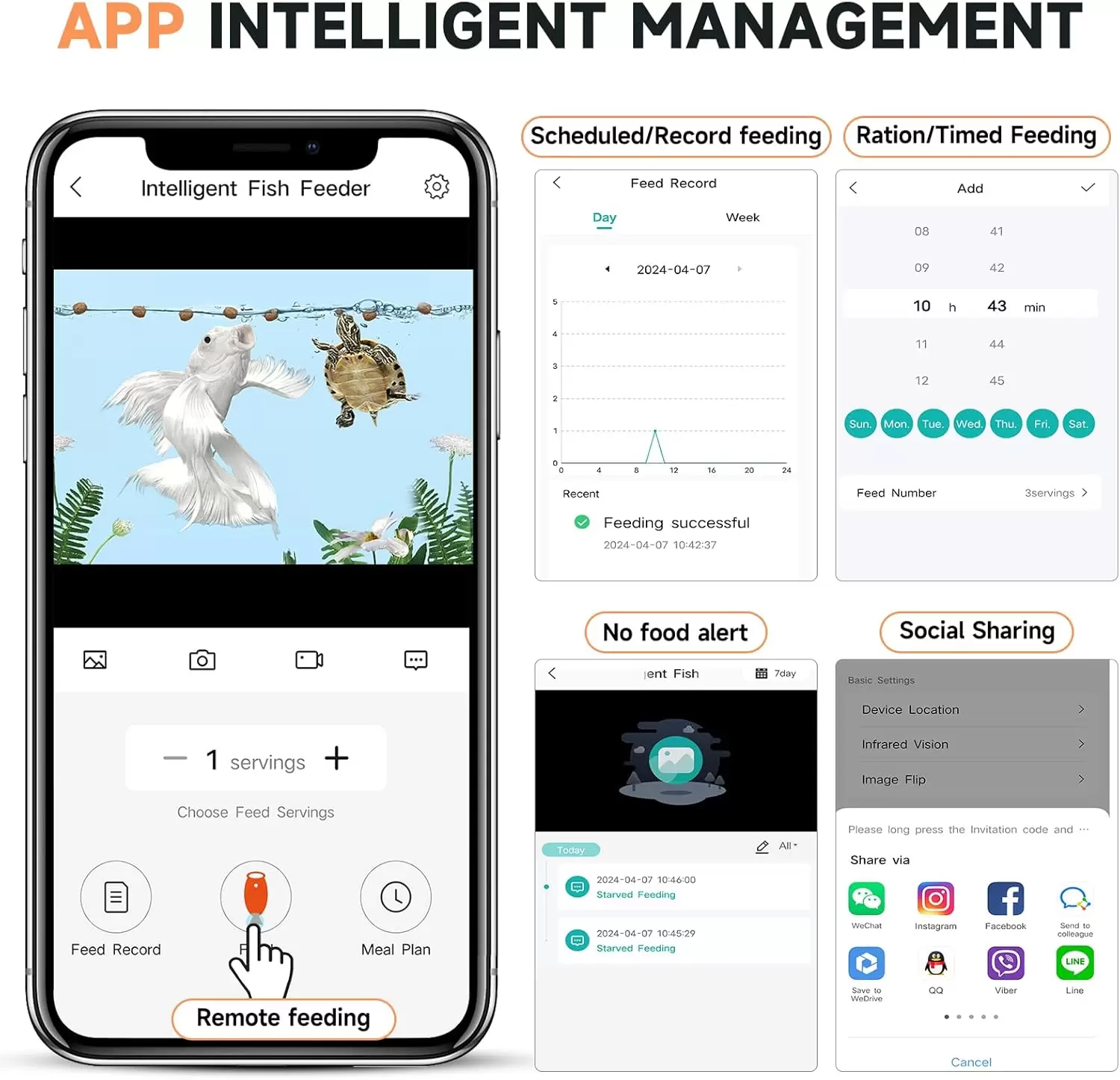 Tiempo de alimentación personalizable y cantidad de alimentación: puede configurar fácilmente el tiempo de alimentación a través de la APP, como alimentar a la misma hora todos los días, alimentar varias veces al día o alimentar una vez cada pocos días. Este comedero para peces también puede controlar con precisión la cantidad de alimentación cada vez, ajustable de 0.4 a 0.78 onzas para evitar la sobrealimentación. Desarrolle un plan de alimentación personalizado para satisfacer sus diferentes necesidades
