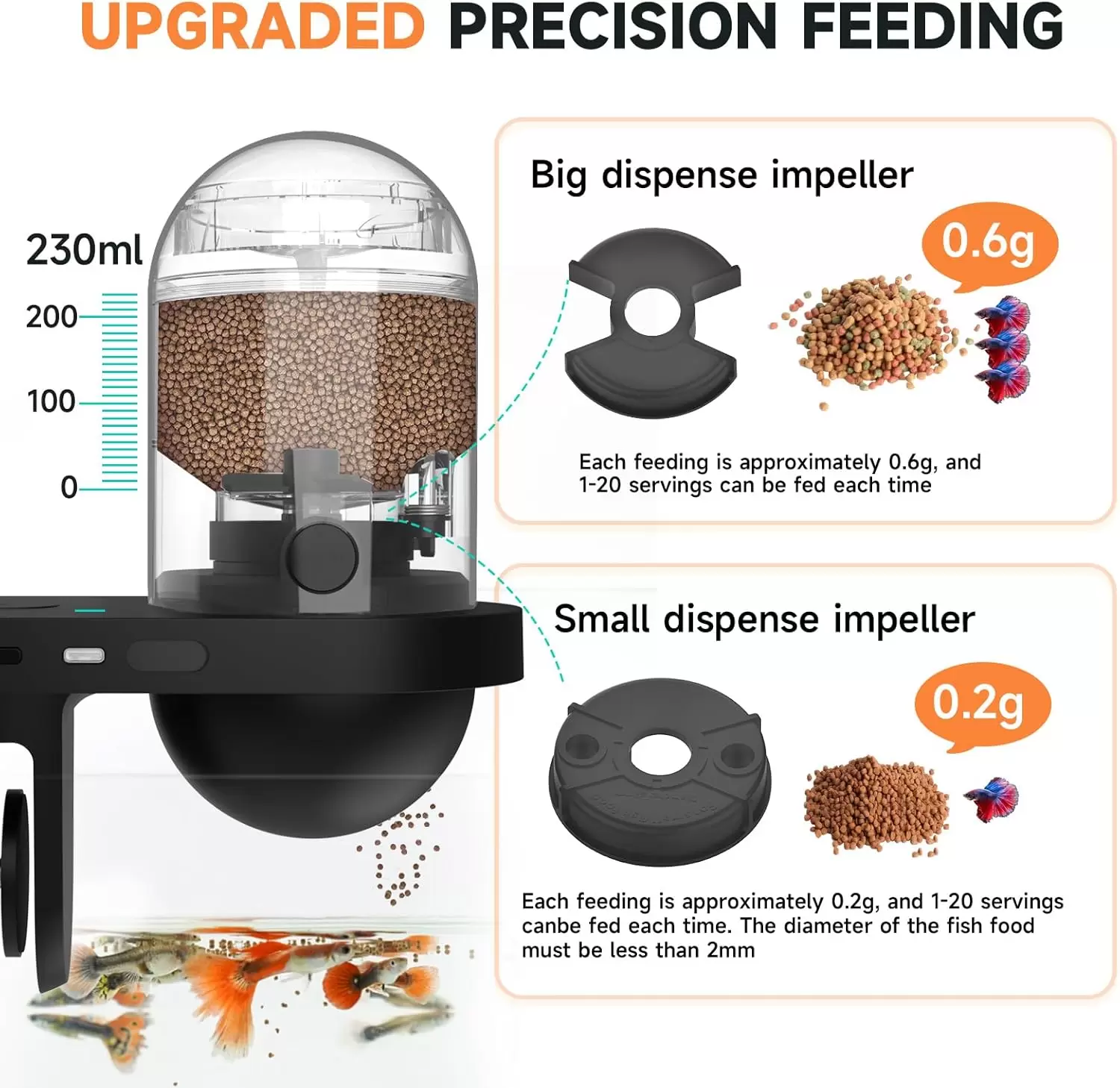 Teniendo en cuenta tanto los peces pequeños como los grandes: Hay dos tipos de puntos de venta de alimentos disponibles para su reemplazo. La salida de alimentos de agujero pequeño libera 0.01 oz de comida cada vez, la salida de alimentos de gran agujero libera 0.02 oz cada vez. Puede elegir la salida correcta según el tamaño y la cantidad de su pescado. Dispensador automático de comedero de peces de gran capacidad de 0.06 galones (7.8 fl oz), adecuado para una variedad de alimentos para peces como polvo, redondo y pilar. Nota: No es adecuado para camarones y hojuelas