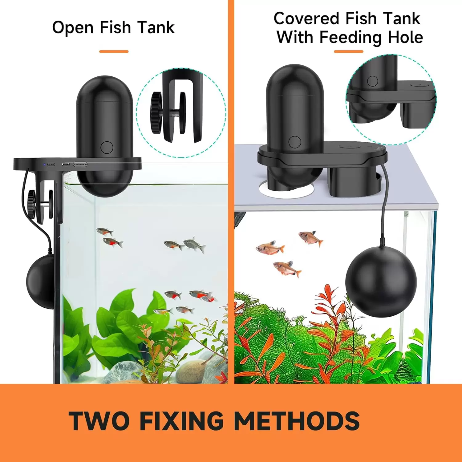 Diseño a prueba de humedad y dos métodos de fijación: a diferencia de otros comederos automáticos para peces que tienen una abertura que siempre está abierta, el alimentador automático hygger se cerrará automáticamente después de cada alimentación para garantizar la frescura del alimento para peces. El comedero de peces de acuario proporciona dos métodos de instalación, se puede fijar al borde de la pecera con un clip, adecuado para acuarios abiertos; o use la base para colocar el comedero en la tapa del acuario con un puerto de alimentación, para acuarios cerrados.