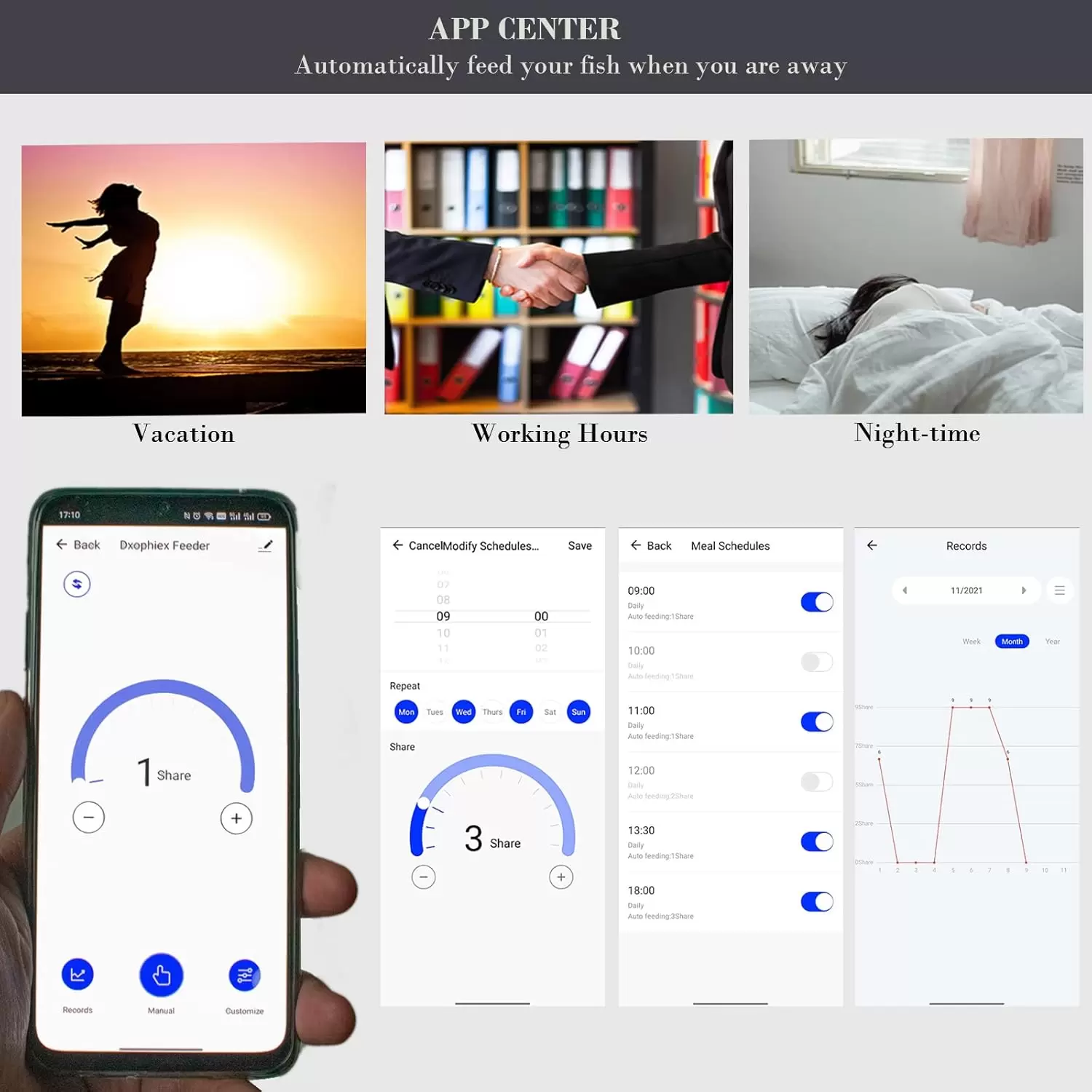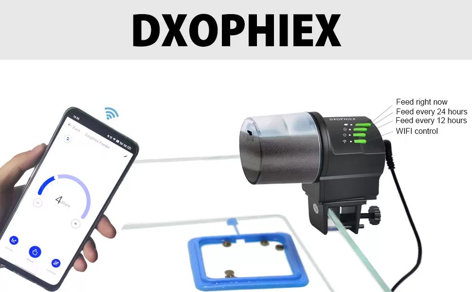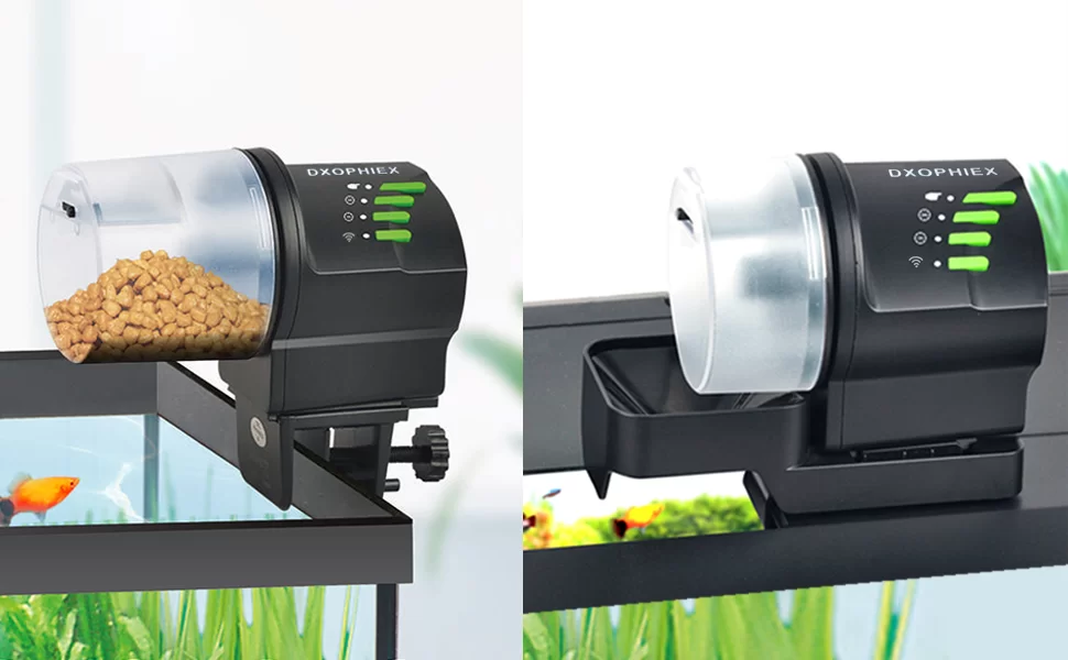 Fácil de añadir alimentos y ajustar el volumen: simplemente empuja la tapa de ajuste de alimentación para aumentar o disminuir el volumen de alimentación fácilmente. Este alimentador automático de peces wifi para acuario es adecuado para la mayoría de los tipos de alimentos como copos, patatas fritas, pellets, graduales, etc.