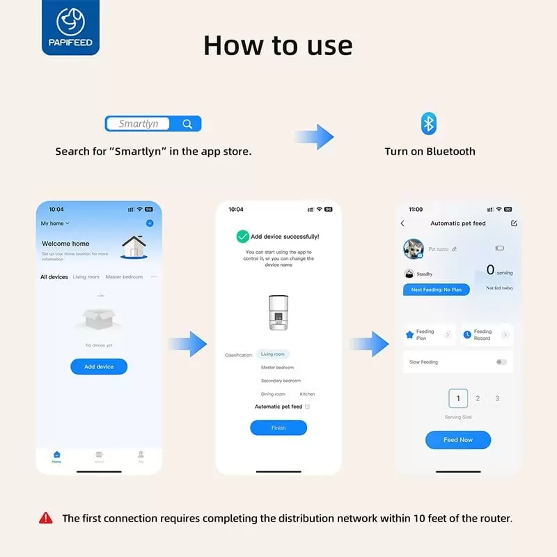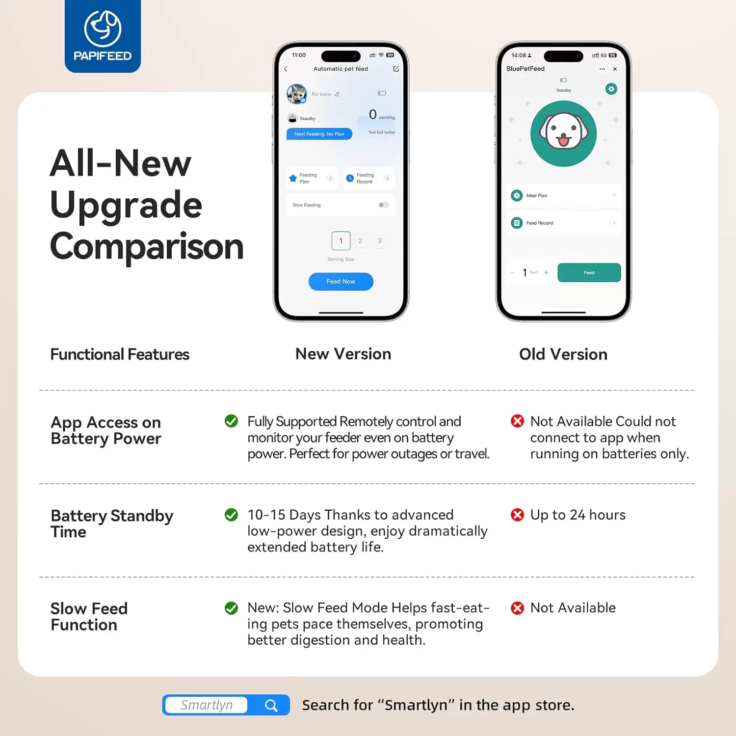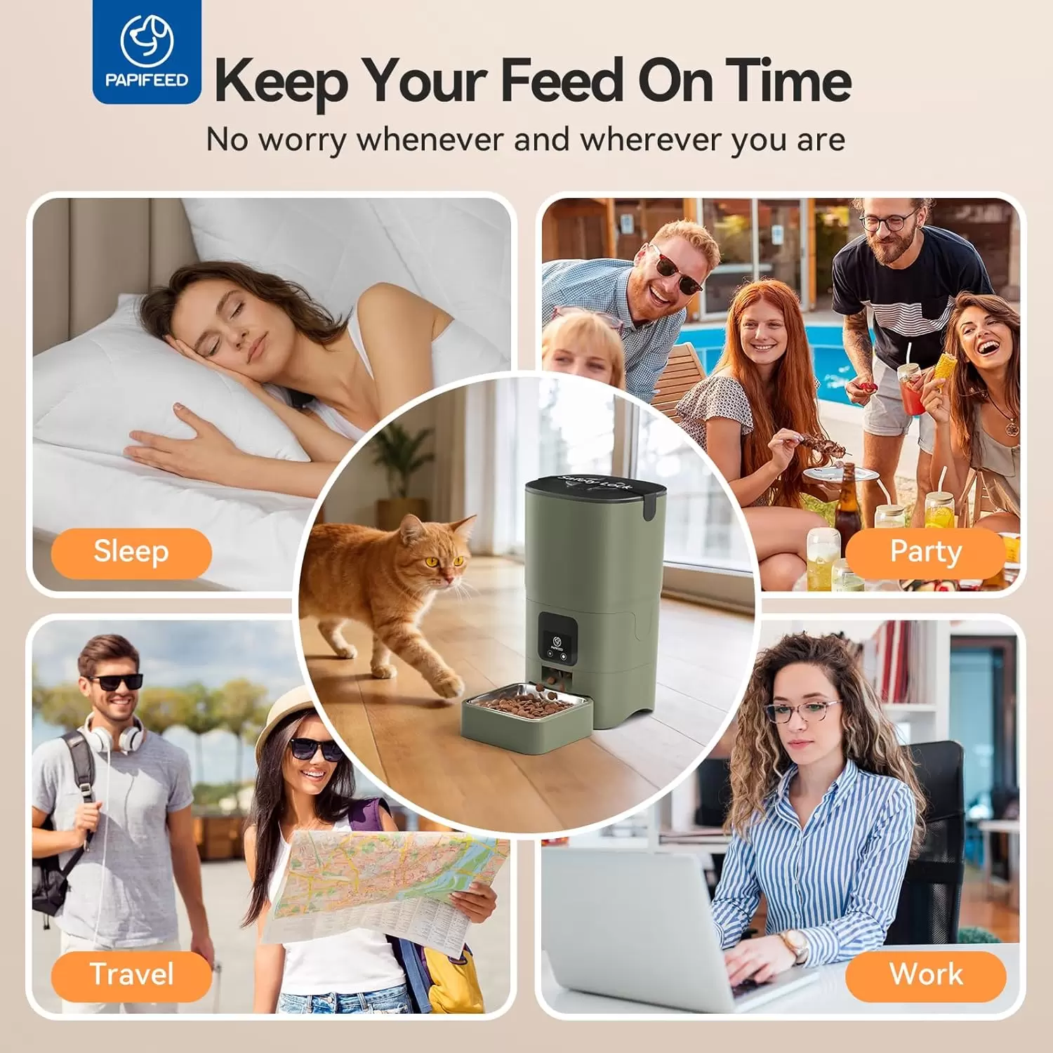 Alimentación totalmente personalizable a través de la aplicación Con la aplicación dedicada (requiere una red Wi-Fi de 2.4 GHz), puedes crear un plan de alimentación flexible con 1 a 12 comidas por día y de 0 a 12 porciones por comida. Esta programabilidad ofrece comodidad para rutinas diarias ocupadas o cuando está fuera en viajes cortos.