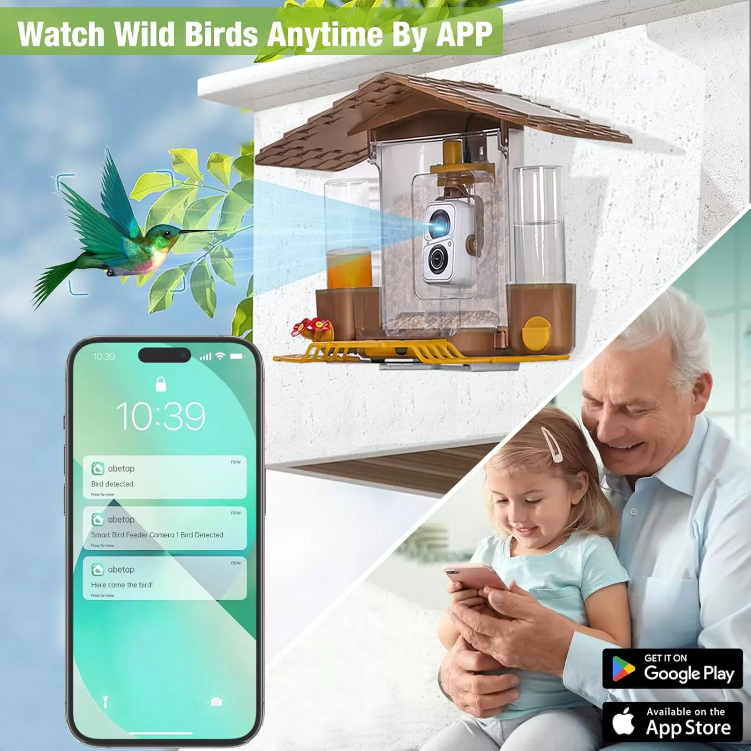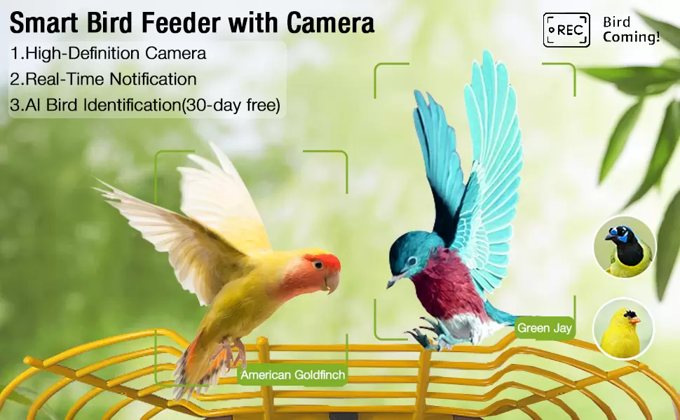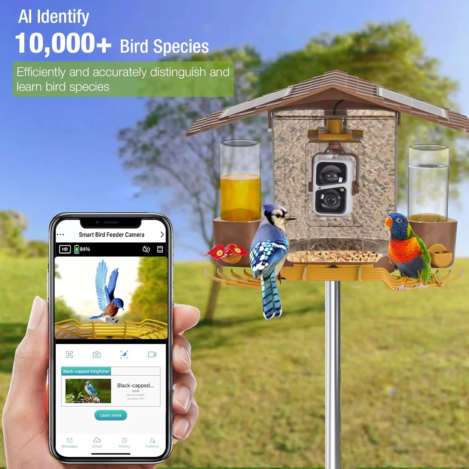 【Cámara HD avanzada de identificación de inteligencia】Este alimentador inteligente de cámara de observación de aves utiliza un sistema avanzado de tecnología de reconocimiento de IA que puede reconocer 10,000 especies de aves, puede ayudarte a comprender mejor a las aves en la naturaleza. El comedero de pájaros con cámara exterior de alta resolución te permite ver y disfrutar de tus pájaros favoritos incluso por la noche.
