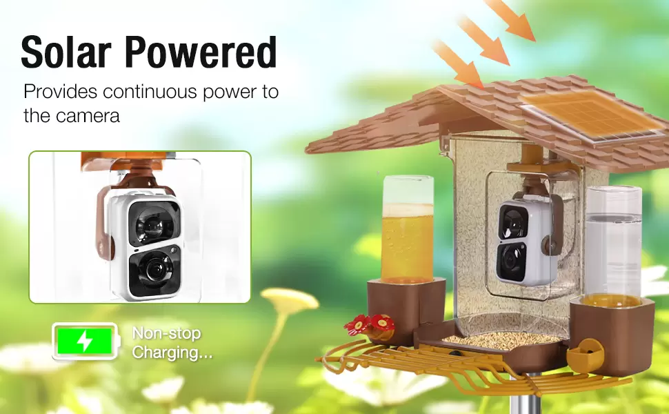 Funciona con energía solar y batería de larga duración: el alimentador inteligente para pájaros tiene una batería recargable integrada de 5000 mAh y también incluye dos paneles solares que se cargan continuamente para garantizar que la cámara inteligente continúe funcionando sin necesidad de cambios frecuentes de batería. Captura la alegría de los pájaros en todo momento.