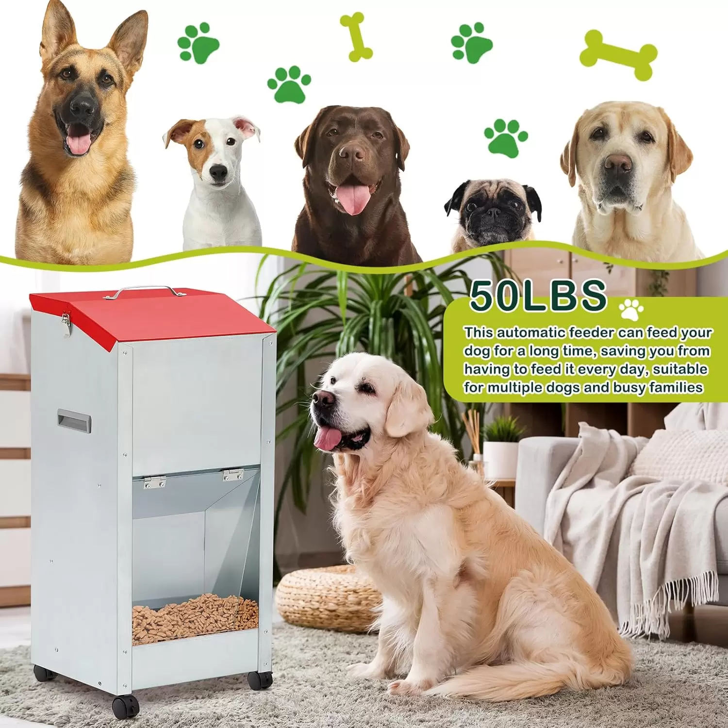 Comedero de gravedad móvil para perros con ruedas de bloqueo: este dispensador automático de alimentos para perros cuenta con ruedas base de rodadura suave con mecanismo de bloqueo, lo que permite una fácil reubicación cuando se llena con 50 libras de comida mientras proporciona estabilidad cuando se bloquea en su lugar