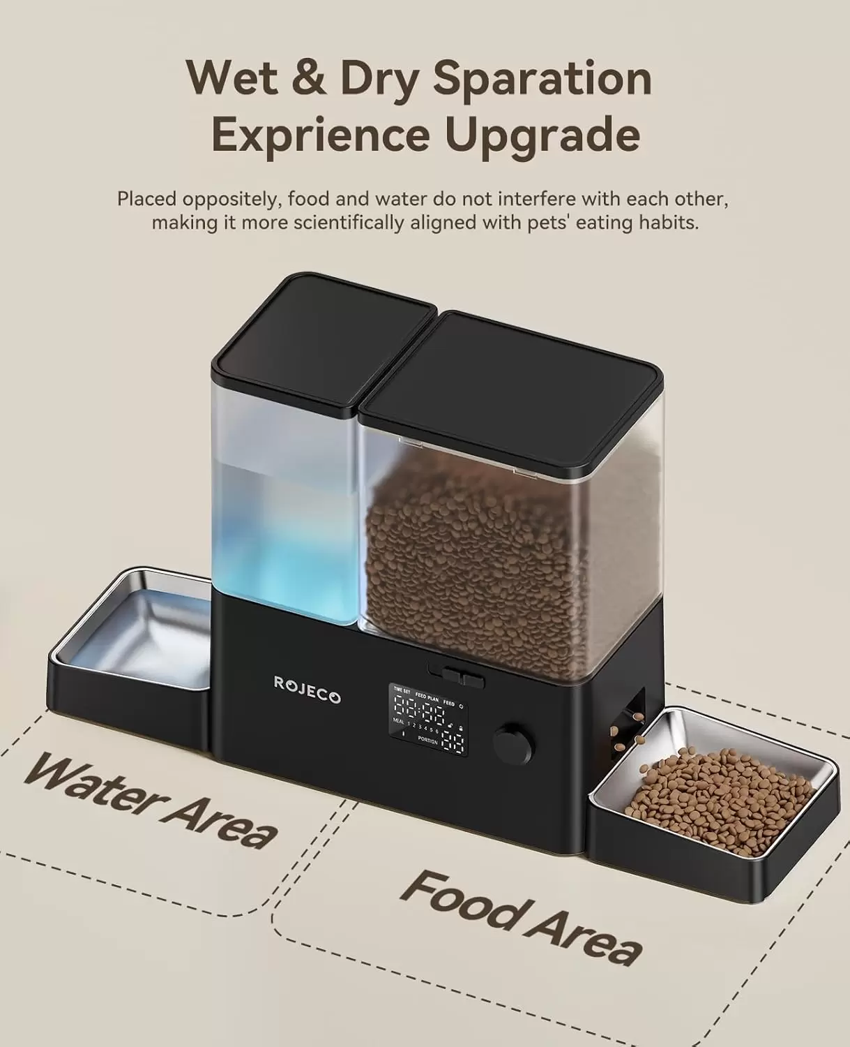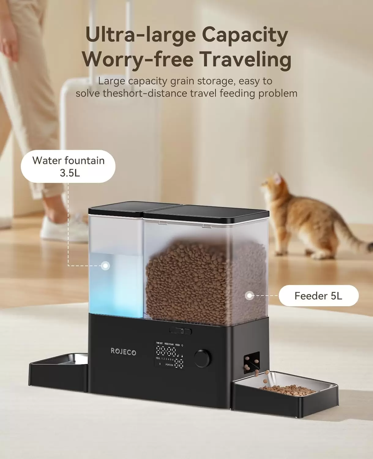 Comedero 2 en 1, alimentación científica: el comedero automático 2 en 1 para perros y gatos y dispensador de agua, el alimentador de agua de alimentación separado evita que los alimentos húmedos y eviten que las mascotas coman alimentos mohosos o húmedos; comida de 5 litros + 3.5 L de agua soporta viajes prolongados (2 gatos hasta 7 días), reduciendo la posibilidad de que las mascotas pasen hambre durante el viaje o horas extras.