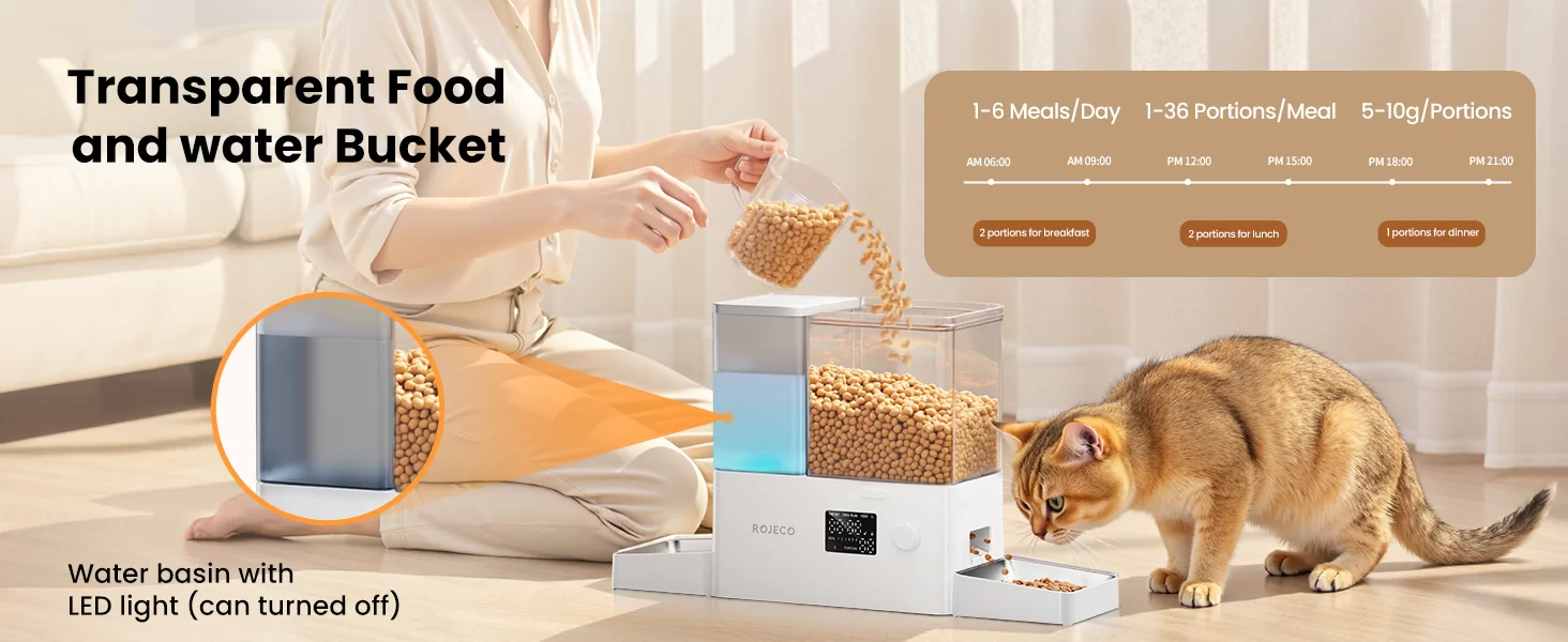 【Alimentación de precisión, recordatorio de tarjeta de grano】Soporta 1-6 comidas/día, 1-36 porciones/comida, 0.18-0.35 oz/porciones. Establezca un plan de alimentación científico y saludable de acuerdo con los hábitos de su mascota y actualice el diseño de granos. Cuando el grano está atascado, la pantalla LED parpadeará el mensaje de tarjeta de grano.