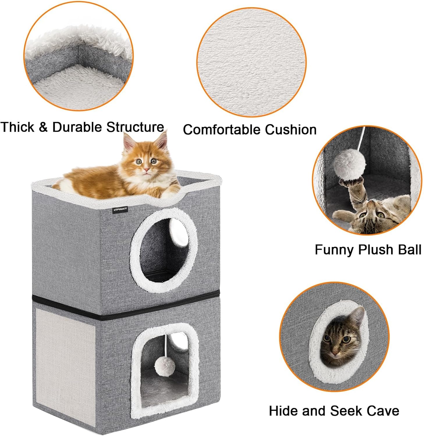 Habitación para gatos de 3 niveles: la casa para gatos URPOWER proporciona 2 niveles de escondites espaciosos para que los gatos se escondan, jueguen y descansen, con un nivel superior que les permite tomar una siesta o mirar por la ventana. La cama interior para gatos proporciona a tus gatos una fuerte sensación de seguridad y mucho espacio, ideal para hogares con varios gatos.