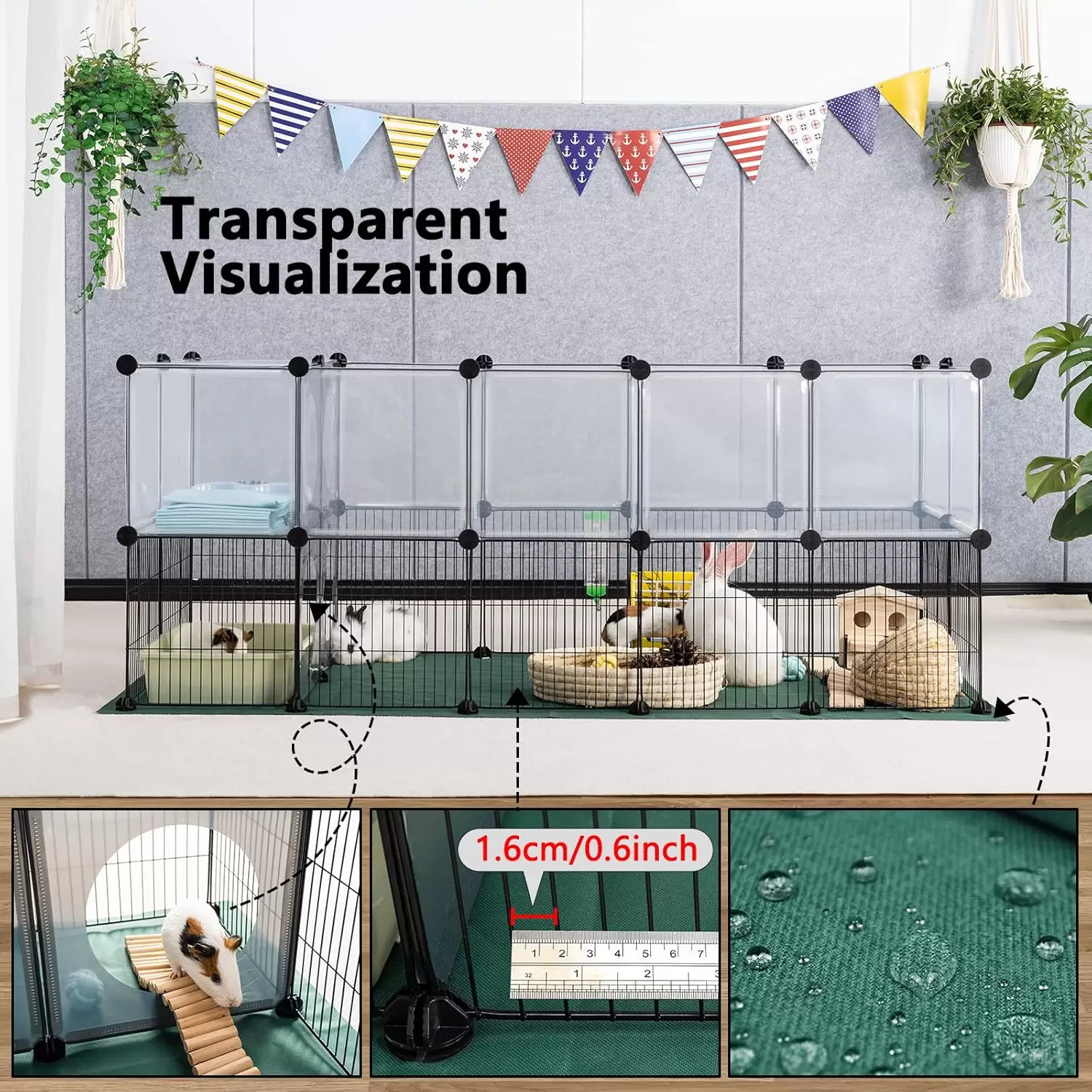 Combinación de hierro-plástico, visualización: Los paneles de plástico transparente y los paneles de malla de hierro mantienen suficiente visualización, puede ver e interactuar con sus conejos, cobayas, erizos, cachorros, hámsters, hurones, tortugas, etc. en cualquier momento; el panel de plástico del corral para mascotas es fácil de limpiar y hermoso; el panel de malla de hierro se encuentra en la capa inferior, que está ventilada y evita que las mascotas masticen.