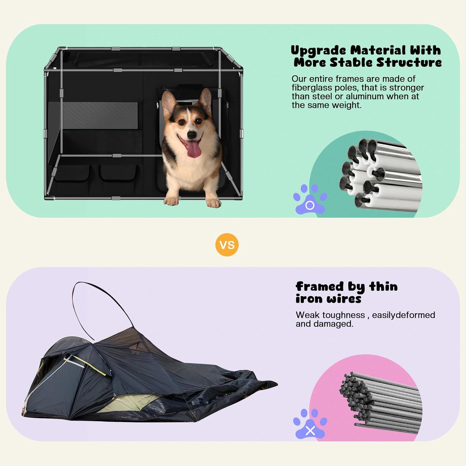 Material mejorado con estructura más estable: en comparación con los parques de tela están enmarcados por cables de hierro finos, todos los marcos del corral portátil para perros están hechos de postes de fibra de vidrio, un material comúnmente utilizado en postes de tienda de campaña al aire libre que es más fuerte que el acero o el aluminio cuando tiene el mismo peso, mientras que también pesa menos y altamente resistente a la corrosión. El corral para perros no se deforma con el desmontaje y uso repetidos.