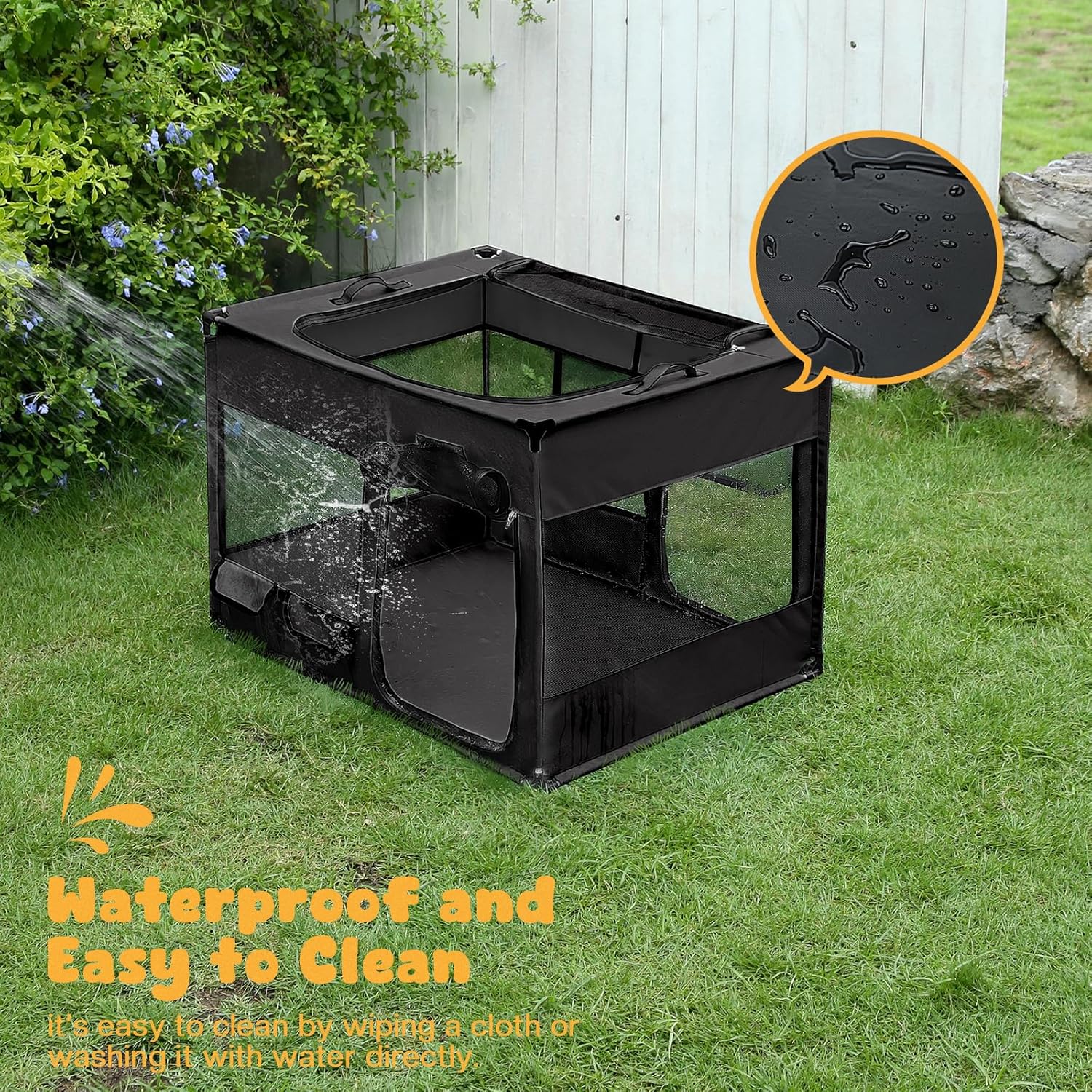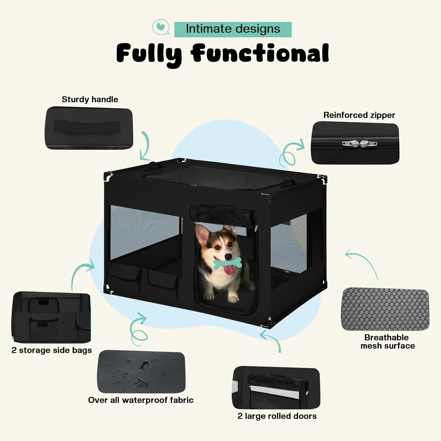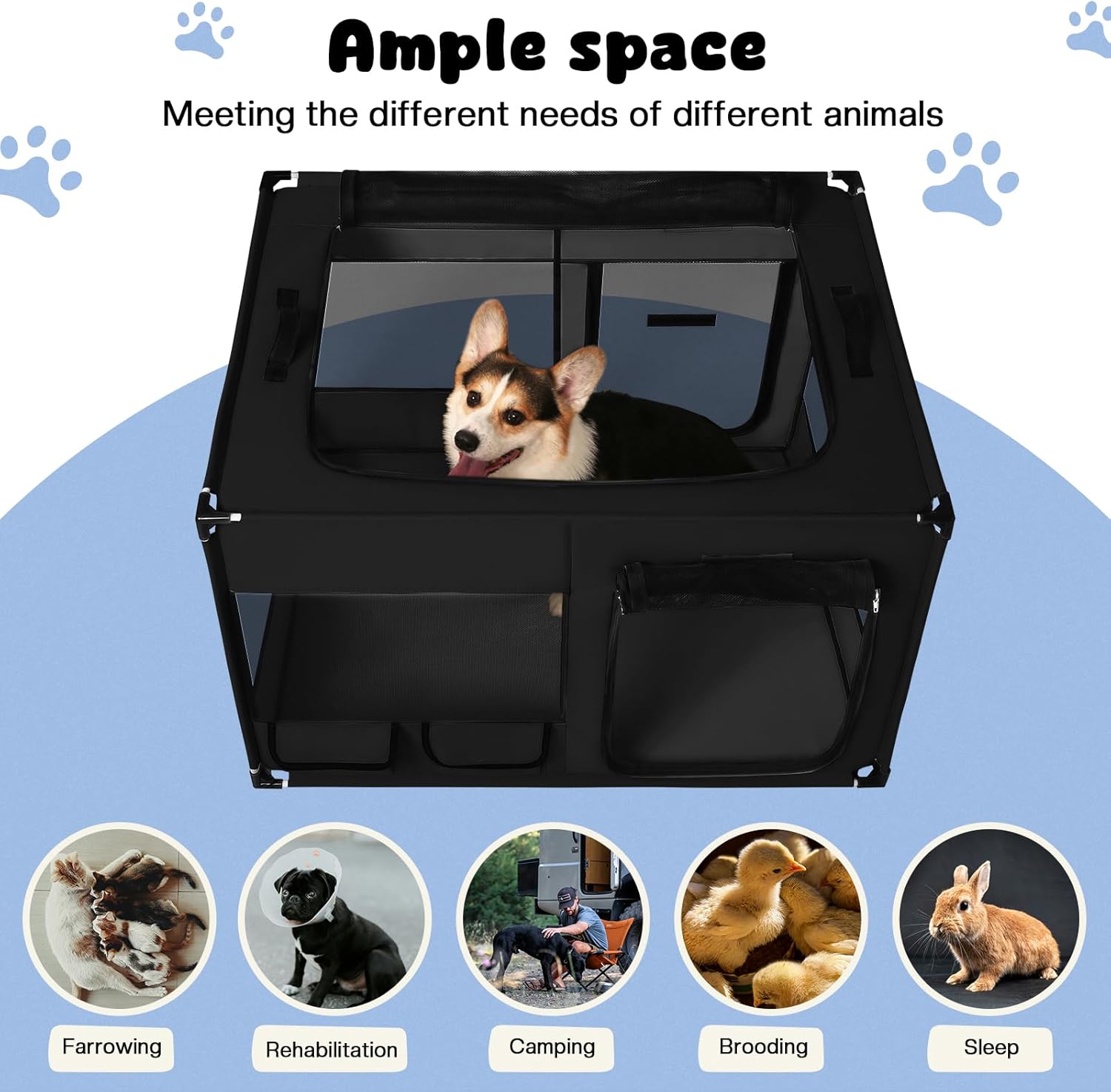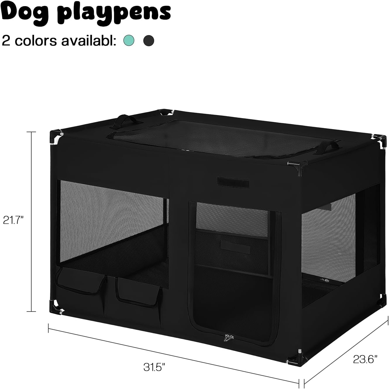 Amplio espacio Dimensiones: 31.5 pulgadas de largo x 23.6 pulgadas de ancho x 21.7 pulgadas de alto. El corral para perros tiene dos grandes puertas enrolladas que permiten que las mascotas entren y salgan fácilmente. Además, también tenemos muchos diseños íntimos: cremallera reforzada (no se puede abrir desde el interior), 2 bolsas laterales de almacenamiento, tela impermeable en general, superficie de malla transpirable de 360 grados que puede aislar a las mascotas mientras reduce su ansiedad.