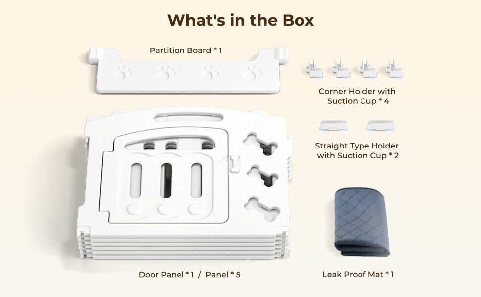 | Componentes incluidos | 1 panel de puerta, 5 paneles, 4 soportes de esquina, 2 soportes de tipo recto, 1 alfombrilla a prueba de fugas |