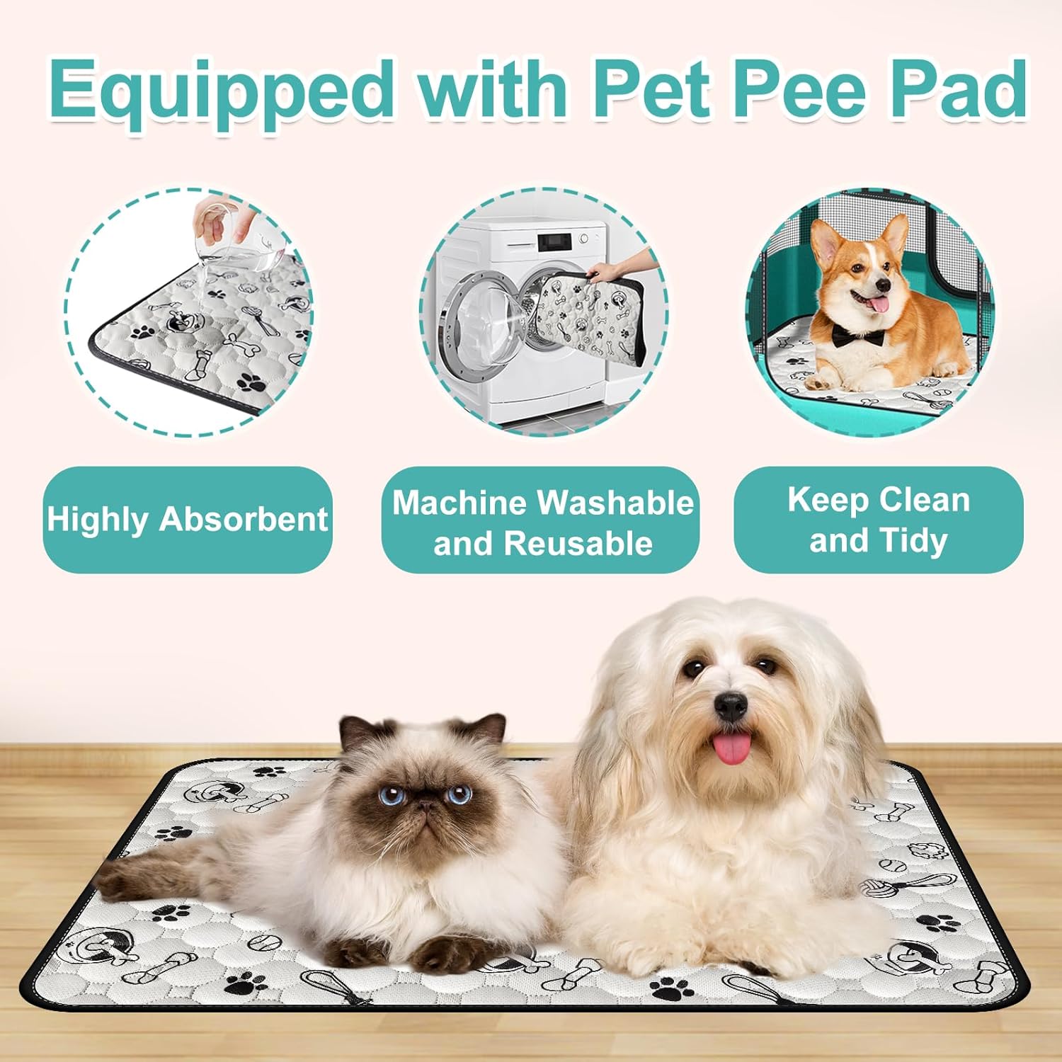 Con almohadillas para orina de mascotas: el corral para cachorros ha equipado con almohadillas reutilizables y lavables. Puedes colocarlo dentro del recinto para gatos para darle a tu mascota un ambiente acogedor. Las almohadillas para orina de mascotas pueden ser lavables a máquina y lavables con agua