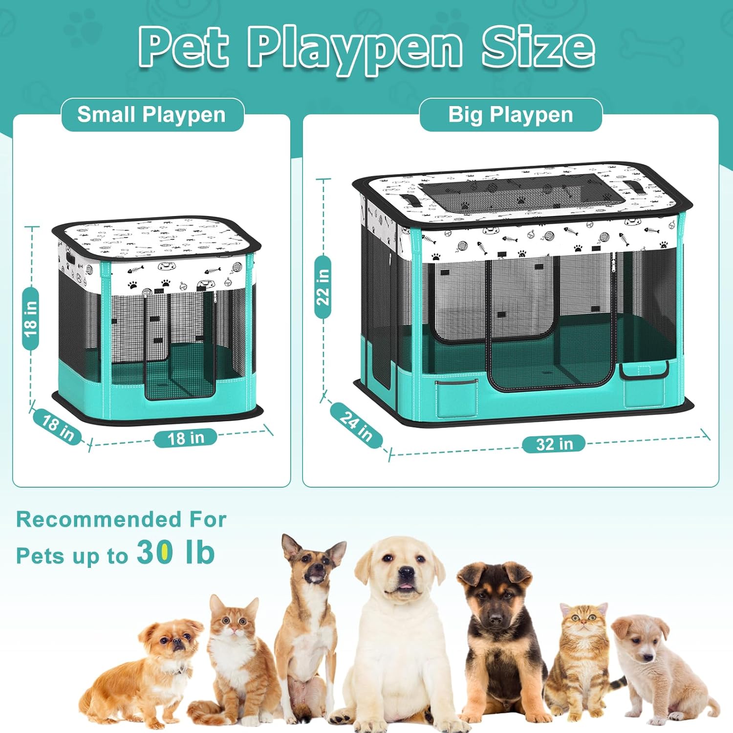 Corralito de tamaño grande: 32 pulgadas de largo x 24 pulgadas de ancho x 22 pulgadas de alto. El corralito para gatos tiene un diseño de bolsillo lateral en el lateral para facilitar el almacenamiento de objetos pequeños que necesitan las mascotas. Adecuado para animales pequeños como uppy, gatito, gato, perro, conejo, etc