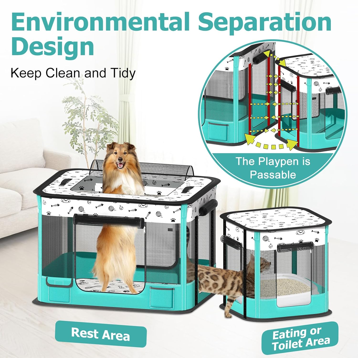 Diseño de áreas separadas: el corralito para mascotas tiene dos áreas funcionales separadas para alimentar, descansar, jugar interactuando y utilizando la caja de arena. ¡Crea un espacio limpio, acogedor y tranquilo para tu amigo felino! Se recomienda el corral de juego para cachorros para caja de arena de hasta 18 pulgadas