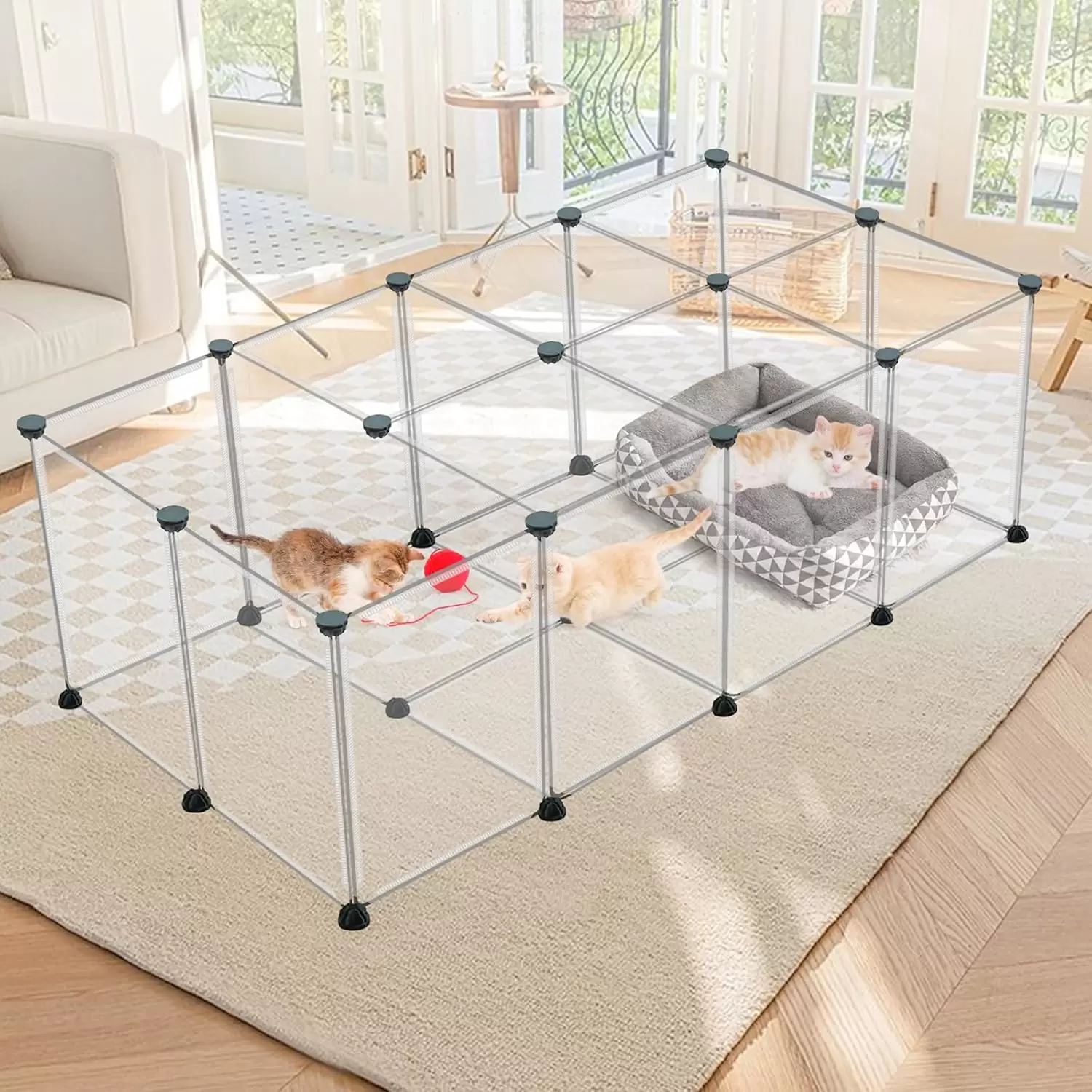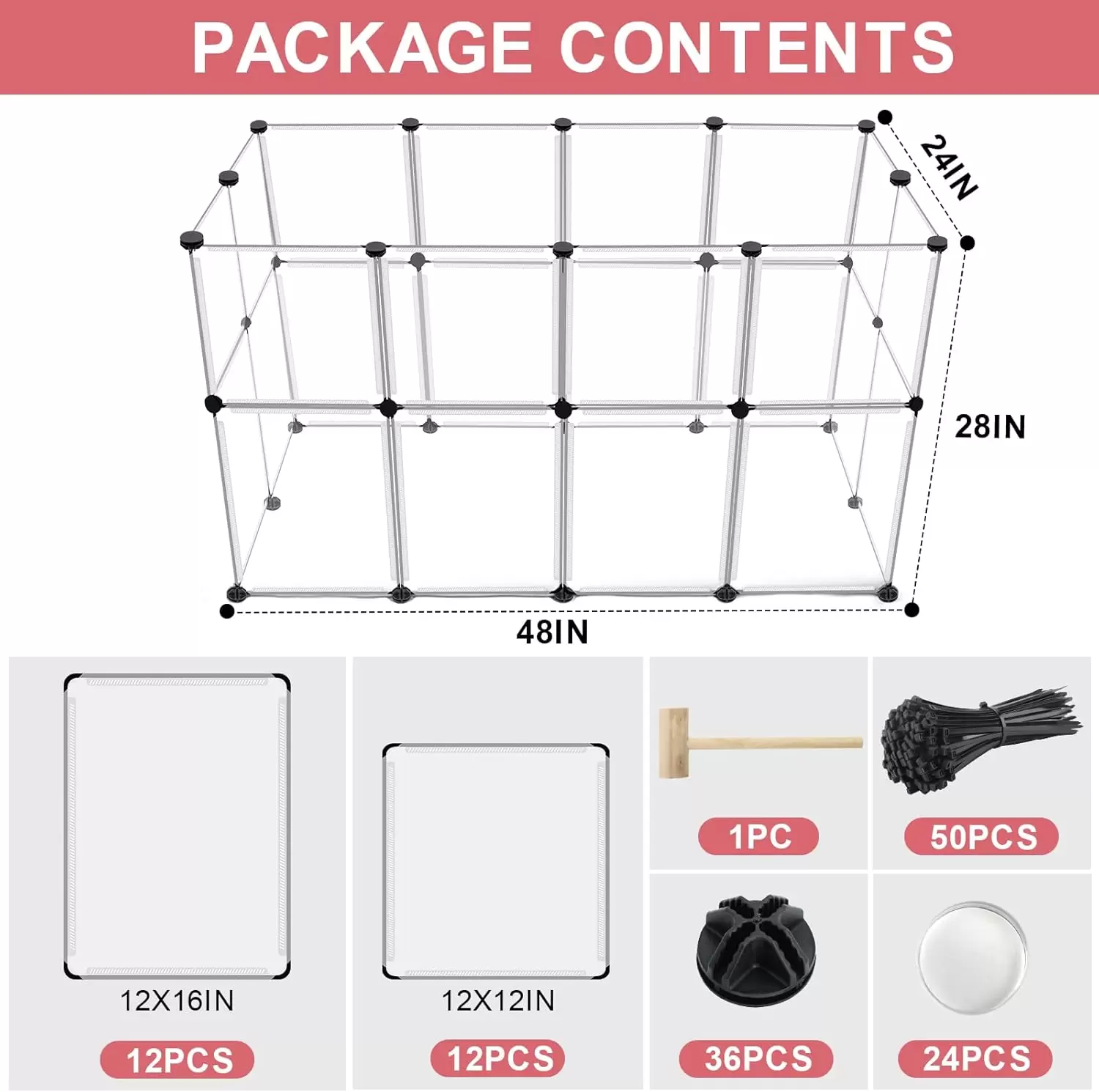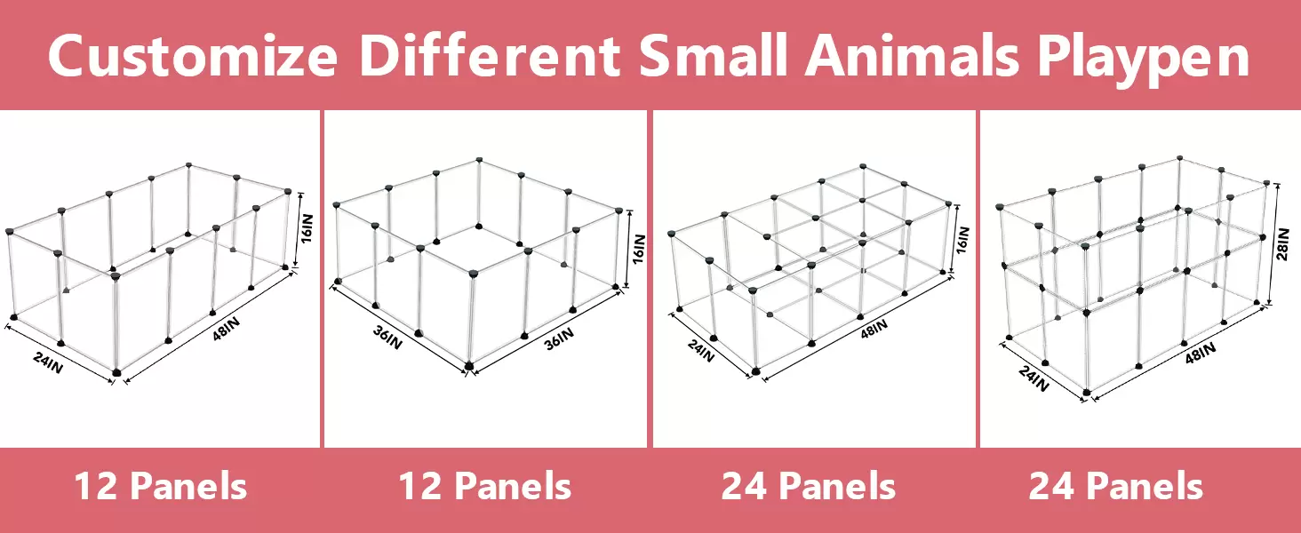 Paquete de corralito para mascotas: cada juego incluye 24 paneles transparentes, 50 bridas de nailon, 36 conectores, 24 tapetes antideslizantes, 1 martillo de madera, 1 manual de usuario (idioma español no garantizado). Este pequeño corralito para animales ofrece un área espaciosa y segura para que tus amigos peludos jueguen y hagan ejercicio. El tamaño montado puede ser de 121.9 x 60.9 x 71 cm.
