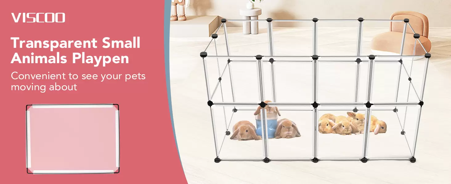 La mejor opción para animales pequeños: el panel de plástico no tiene bordes afilados y no daña a los animales pequeños. El corral transparente VISCOO para animales pequeños se puede utilizar como una jaula de conejillo de indias, corral de conejo o conejitos, jaula de conejo o conejito, cerca de interior o exterior para conejo o conejito, o valla de patio. Es una opción absolutamente versátil y práctica para los dueños de mascotas.