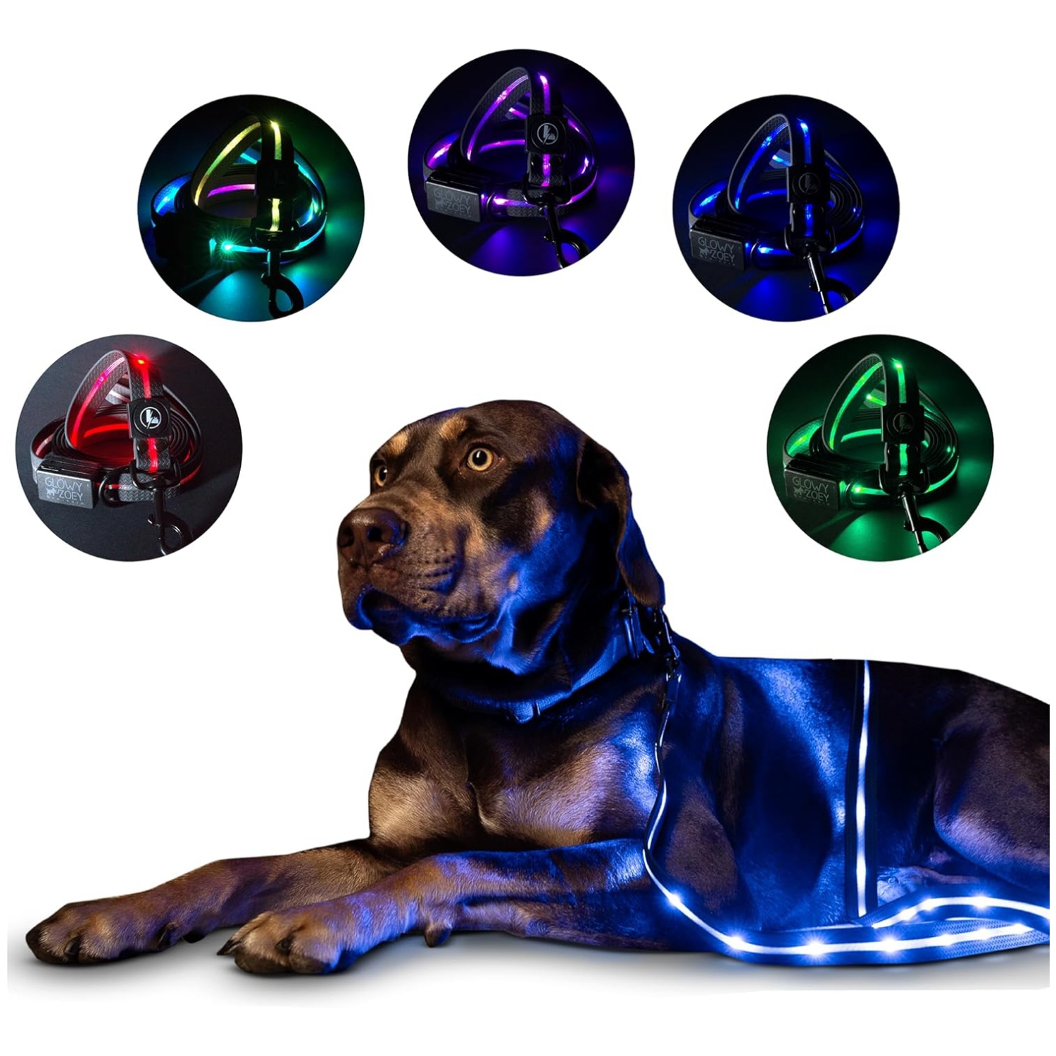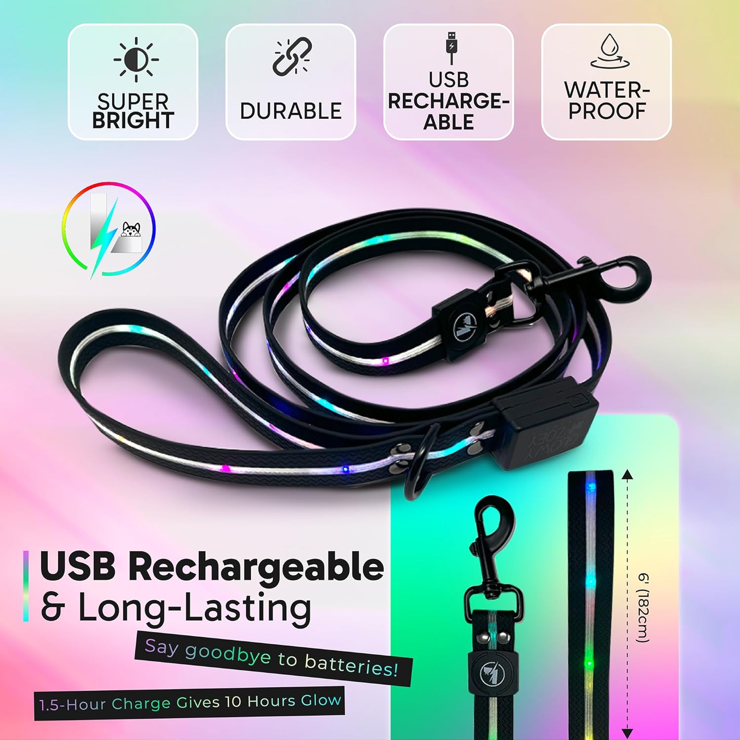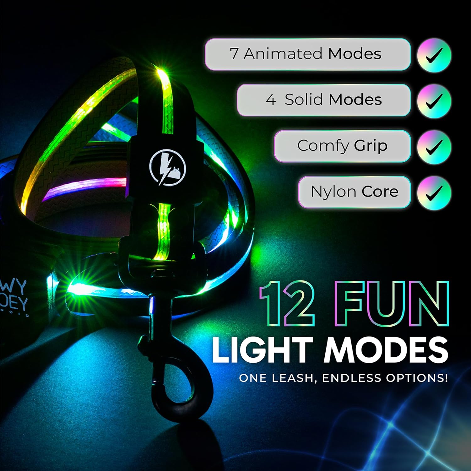 12 modos de luz divertidos: ¡una correa, infinitas opciones! Cambia a través de 7 modos animados (Rainbow Sparkle, Rainbow, Red Bounce, Green Bounce, Blue Bounce, Pink Bounce, Multi-Color Bounce) y 4 modos vibrantes de color sólido (rojo, azul, verde, rosa). Simplemente presiona el botón para encontrar tu combo favorito e ilumina cada caminata, trote o caminata con tu perro.