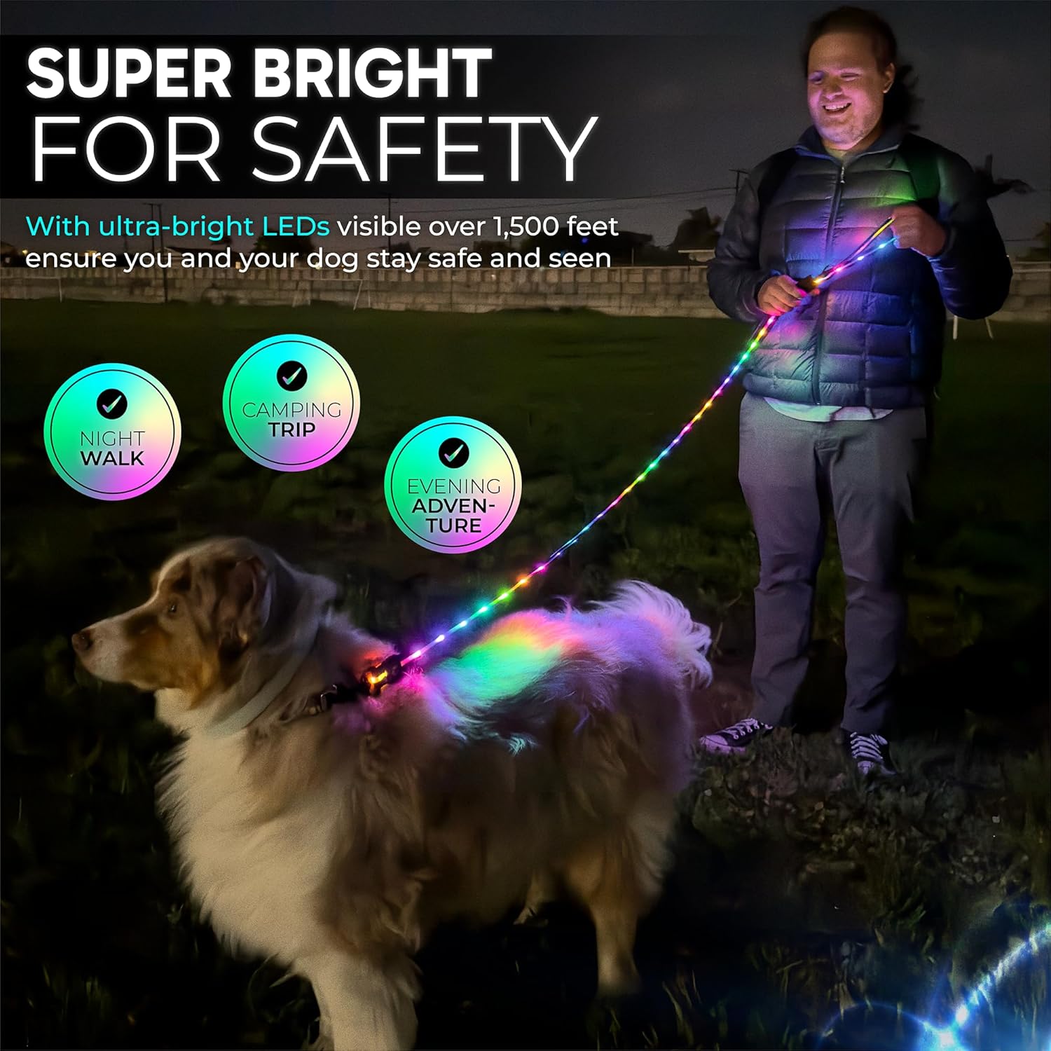 Superbrillante para mayor seguridad: con LED ultrabrillantes visibles a más de 1,500 pies de distancia, esta correa se asegura de que usted y su perro sean vistos. Ya sea que estés esquivando autos, bicicletas o criaturas sombrías en la oscuridad, siempre iluminarás el camino y tal vez robarás el centro de atención.