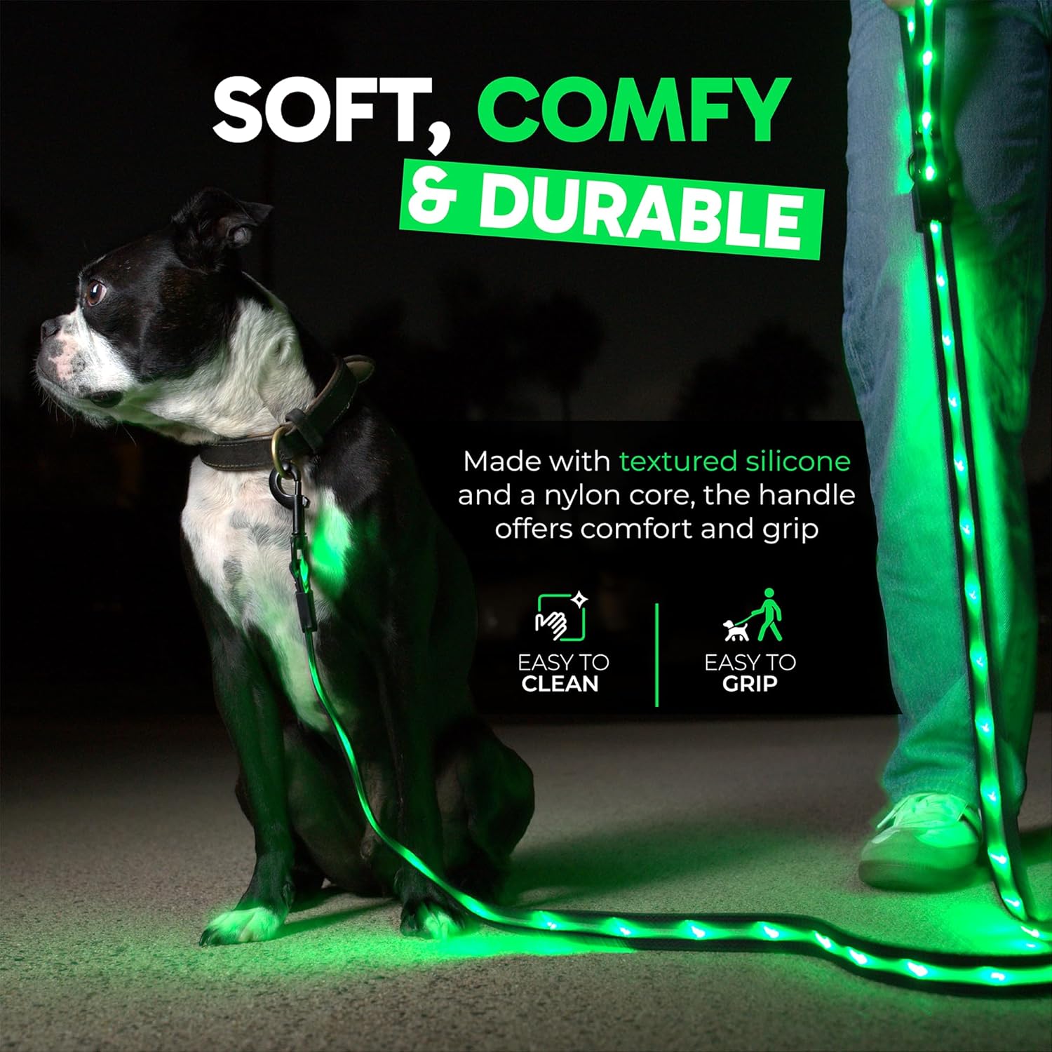 Suave, cómodo y duradero: fabricado con silicona texturizada con un fuerte núcleo de nailon, el mango se siente agarre y suave en tu mano, incluso durante esos tirones repentinos cuando tu perro ve esa ardilla malvada. Fácil de limpiar también. Simplemente límpialo con una toalla húmeda.