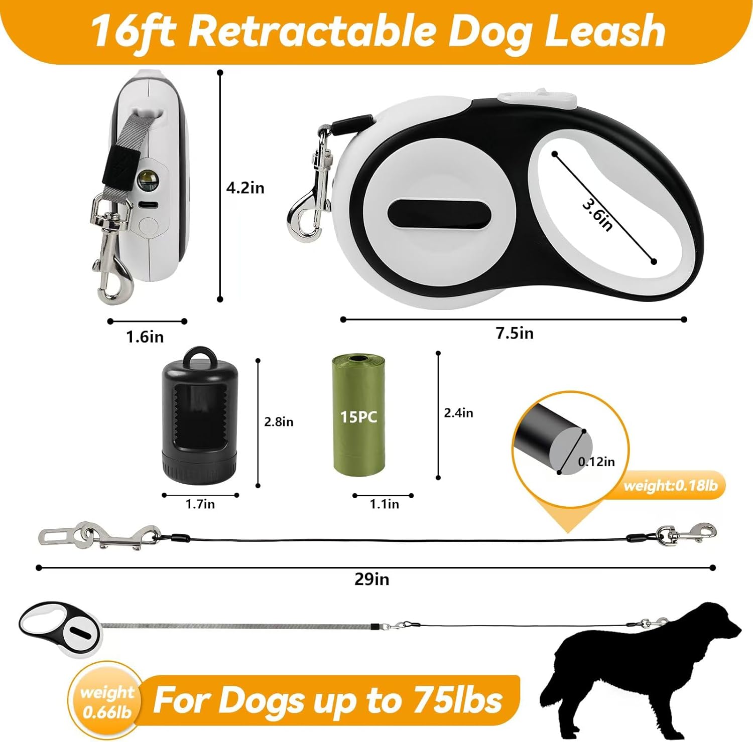 Diseño de mango antideslizante: esta correa retráctil de 16 pies para perros es ideal para perros pequeños y medianos de hasta 75 libras. El mango ergonómico y antideslizante proporciona un agarre seguro, perfecto para llevar a tu perro a un paseo al aire libre, trotar o caminar. El cable antimordidas incluido se puede utilizar por separado para asegurar de forma segura a tu perro en un asiento de automóvil.