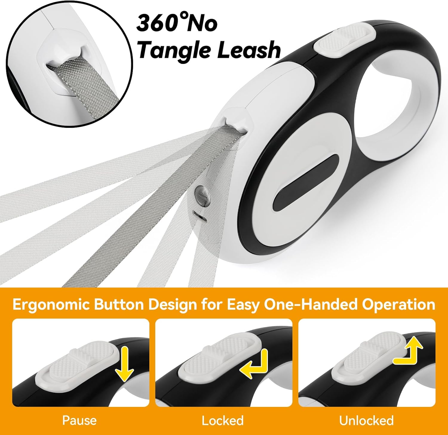 Sistema de frenos con una sola mano : esta correa retráctil para perro cuenta con un sistema de frenado de un solo toque que permite la operación con una sola mano para frenar, pausar y bloquear. Pulsa el botón de freno para detener la correa, presiona el botón de bloqueo para pausa, soltando el botón permite una retracción rápida y segura de la correa con tensión de resorte perfecta, lo que te da un fácil control mientras deja que tu perro corra libre y de forma segura.