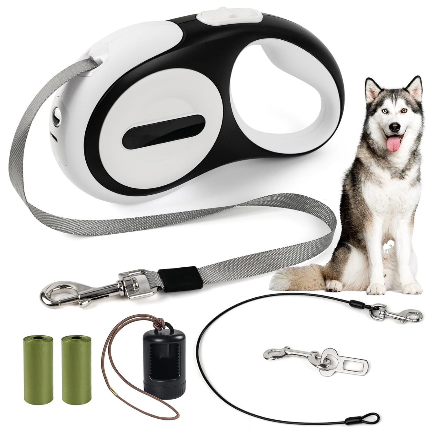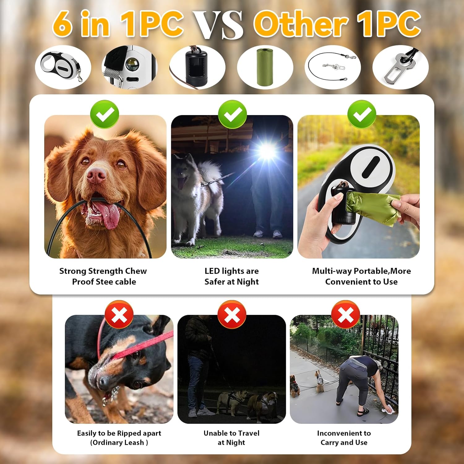 Combinación perfecta 6 en 1 : esta correa retráctil para perro se ha actualizado a una configuración 6 en 1, equipada con una luz LED, 2 bolsas de excremento y dispensadores, cable de acero antimasticación de 21.5 x 2 pulgadas, diseño integrado que hace que sea fácil de transportar. Si tienes un perro al que le gusta masticar, conecta el cable de acero antimasticable en la parte delantera de la correa, lo que puede resolver perfectamente el riesgo de ser mordido.