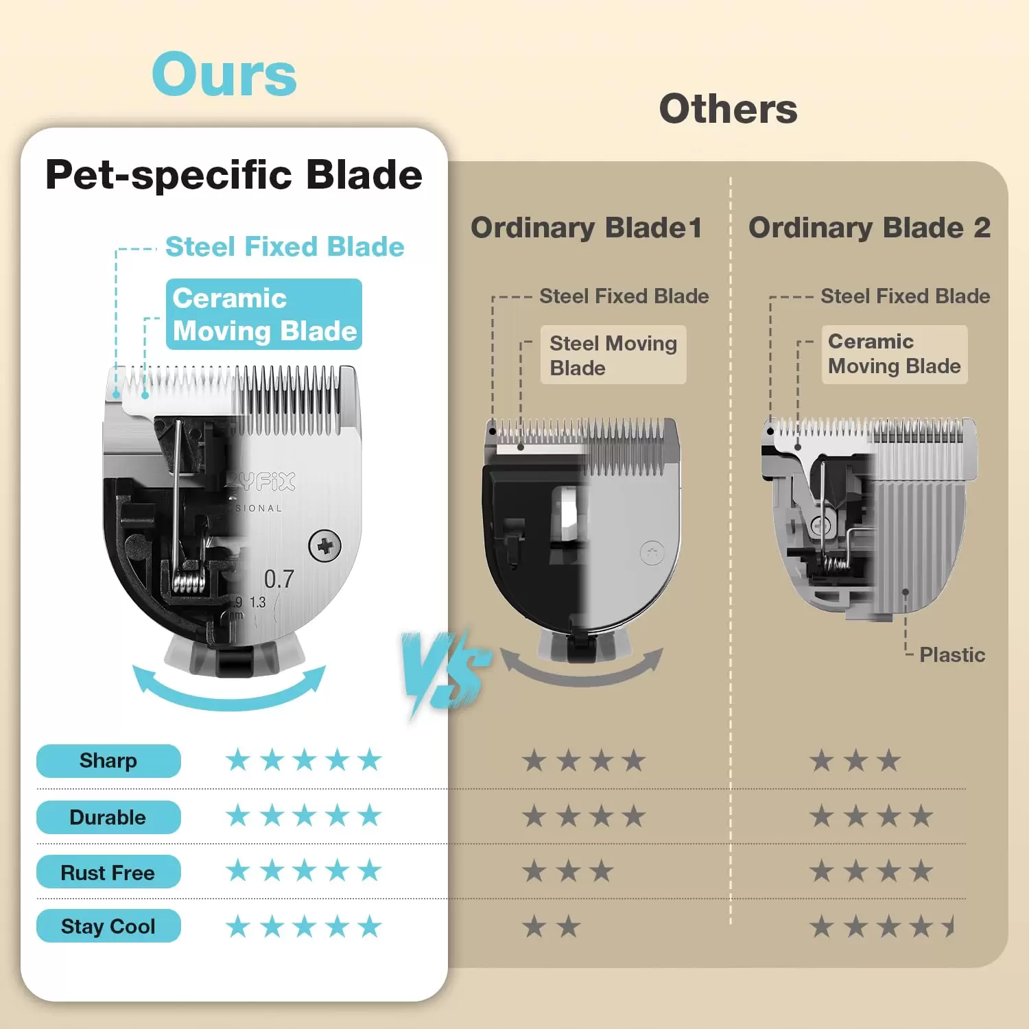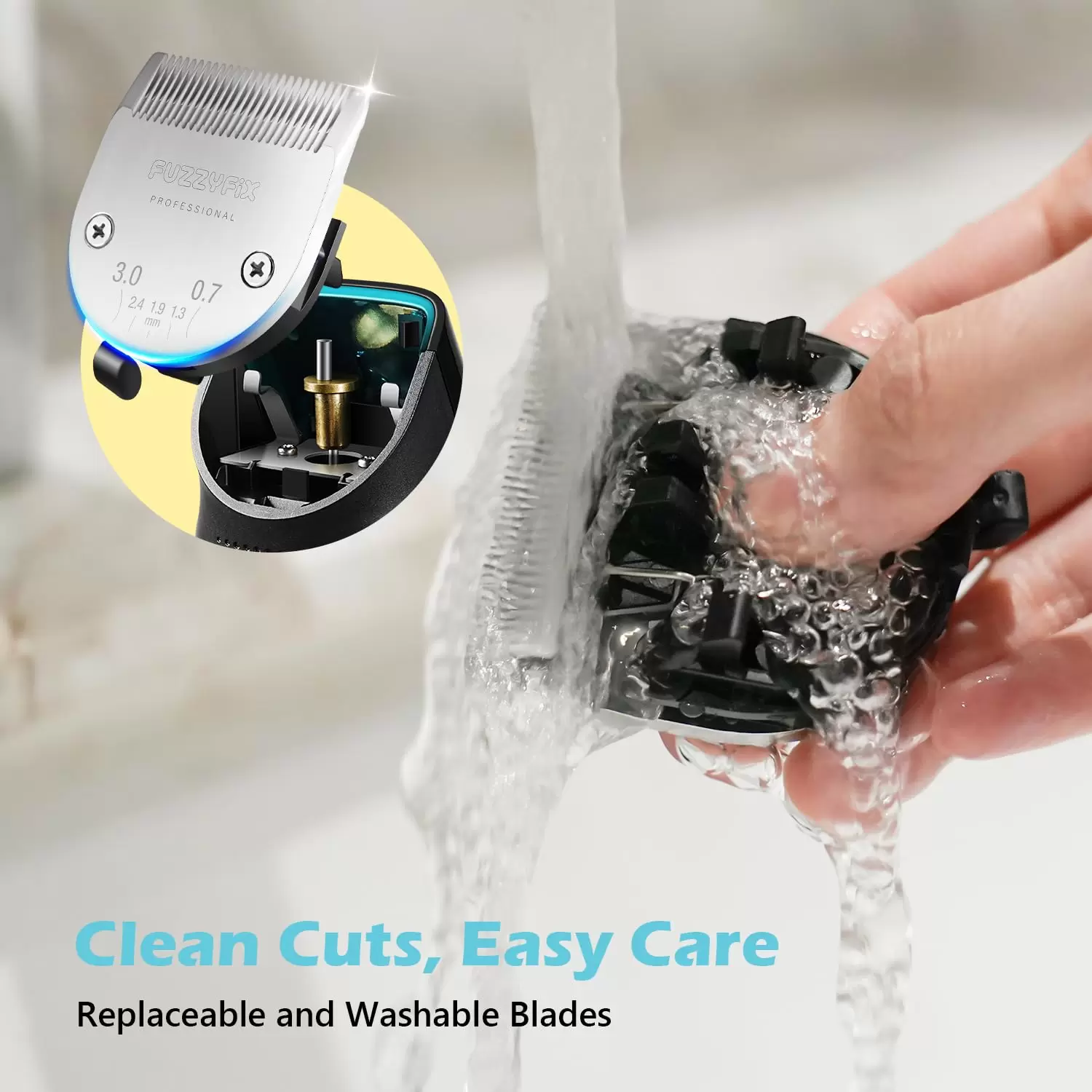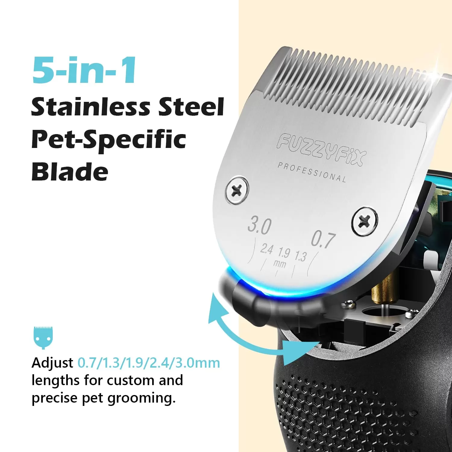 Cuchilla ajustable 5 en 1 de acero inoxidable y cerámica: la cortadora de perros FuzzyFix cuenta con una nueva hoja 5 en 1 fabricada con acero inoxidable y cerámica. Se ajusta fácilmente entre longitudes de 0.7/1.3/1.9/2.4/0.118 in para un aseo preciso y personalizado de las mascotas, garantiza una nitidez excepcional, resistencia a la corrosión y un rendimiento duradero. Se mantiene fresco incluso durante largas sesiones.