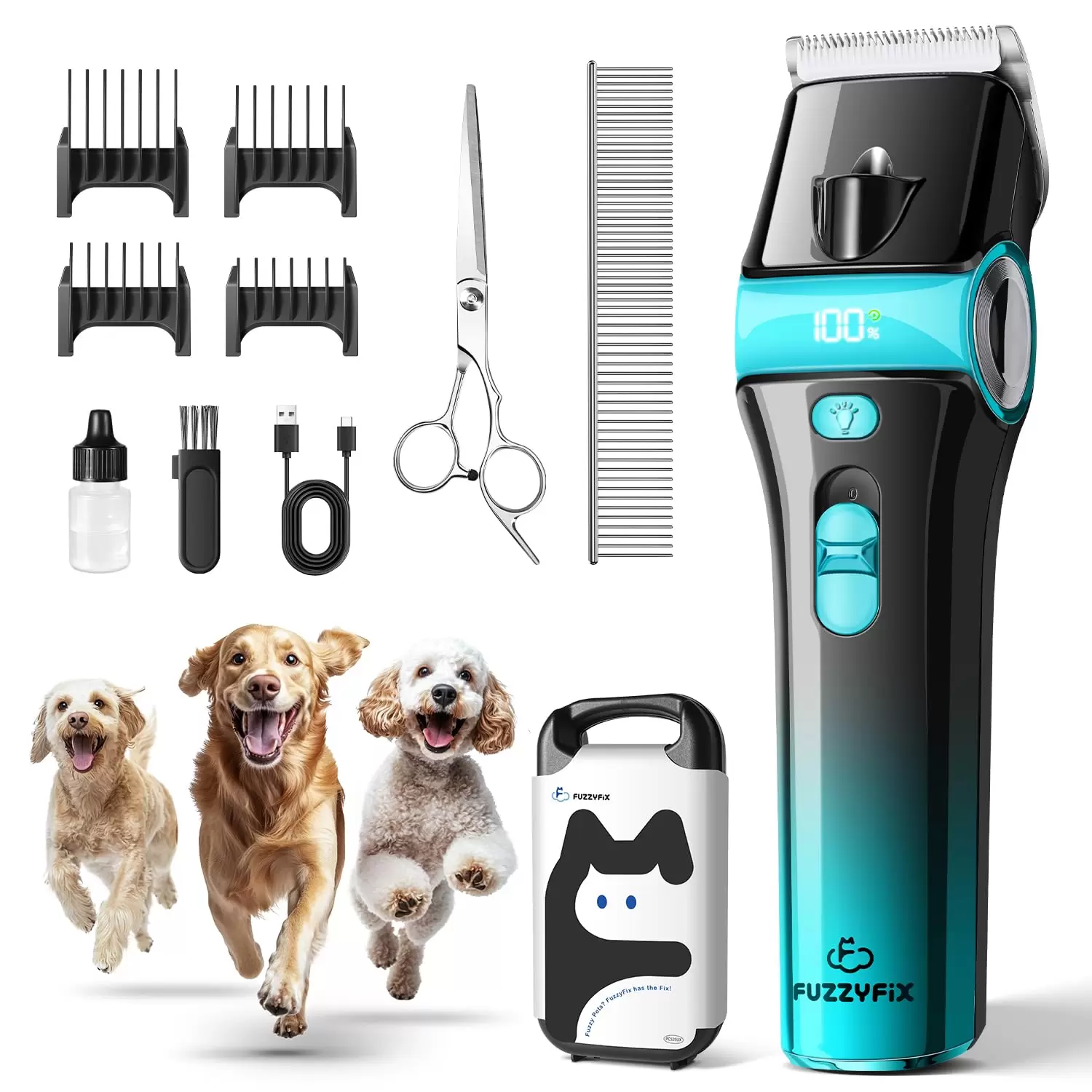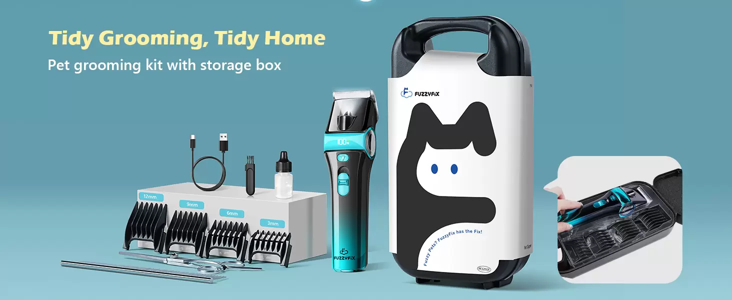 Kit completo de aseo con caja de almacenamiento incluida: el kit de aseo para perros FuzzyFix viene con un juego completo de accesorios, incluyendo una caja de almacenamiento, cortaúñas para perros, tijeras, peine, 4 peines guía (0.118 in/0.236 in/0.354 in/0.472 in), cepillo de limpieza, cable USB y aceite de aseo. En comparación con las cortadoras tradicionales, es una solución integral que facilita que incluso los principiantes comiencen a arreglar